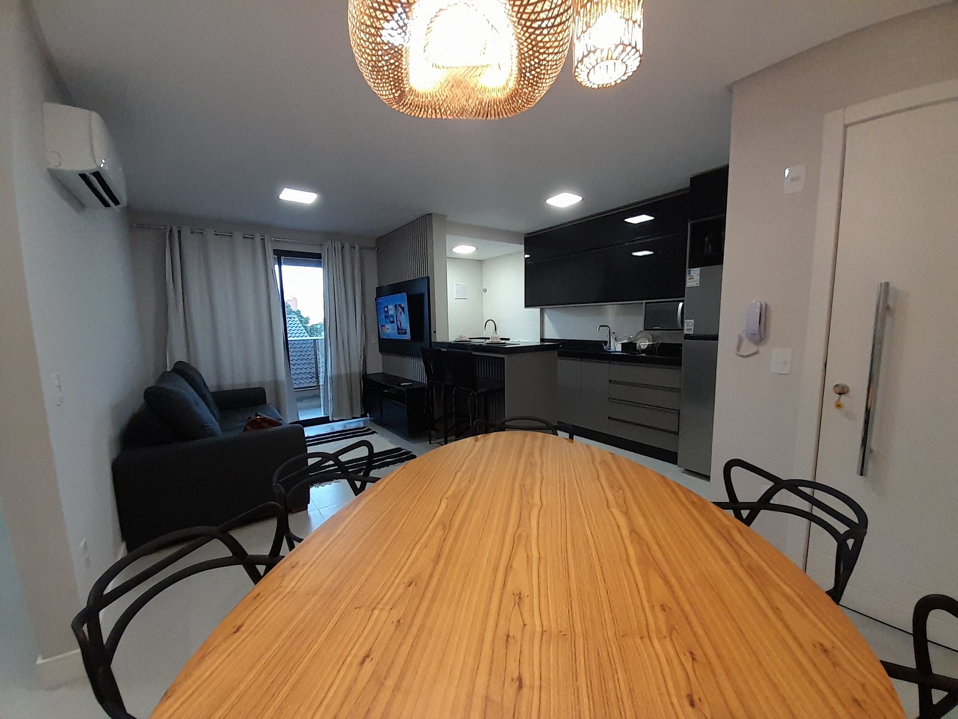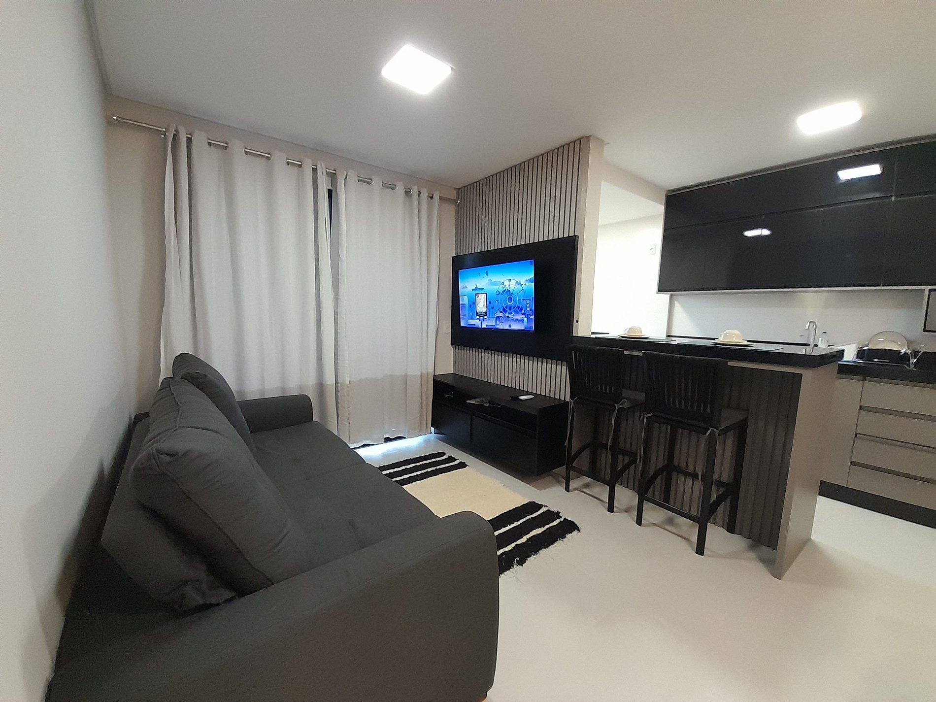 Sala com tv smart e cozinha equipada, mesa de jantar
