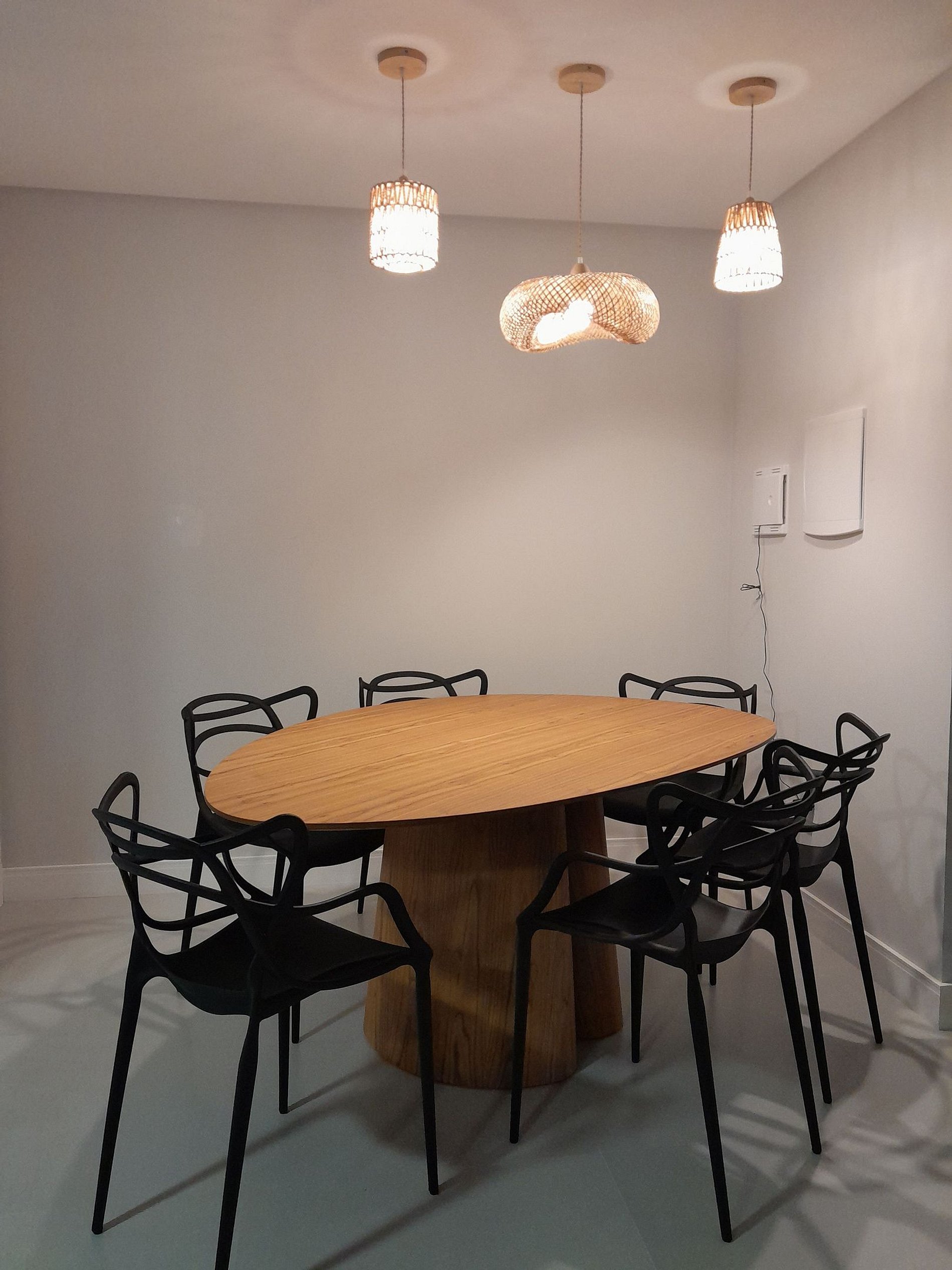 Sala com tv smart e cozinha equipada, mesa de jantar