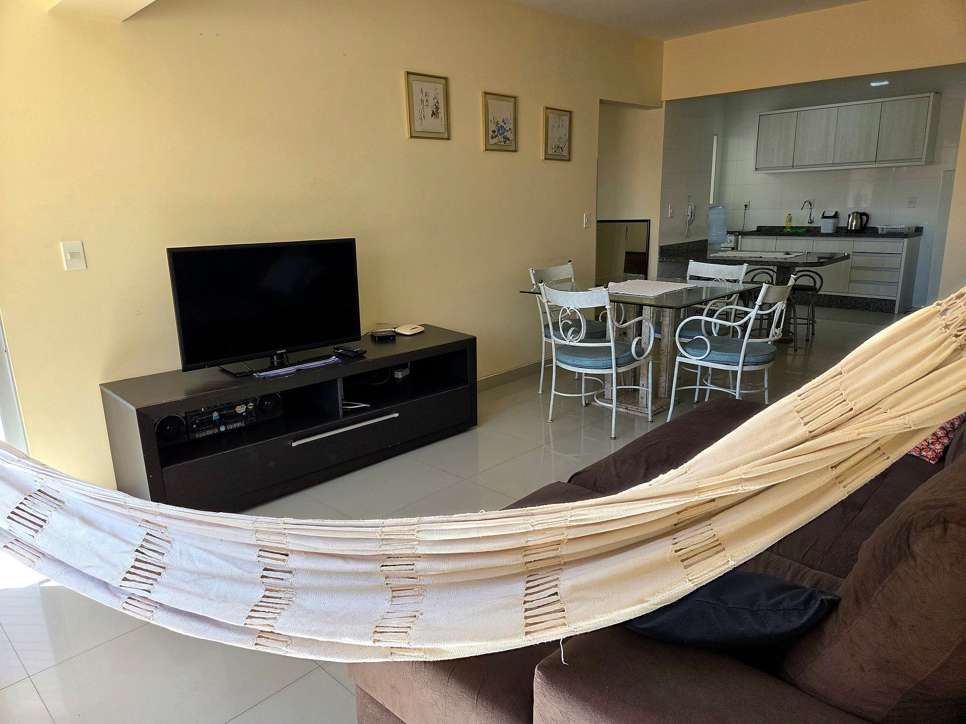 -Sala de estar com sofá retrátil, Tv smart, mesa de jantar, ventilador de chão;