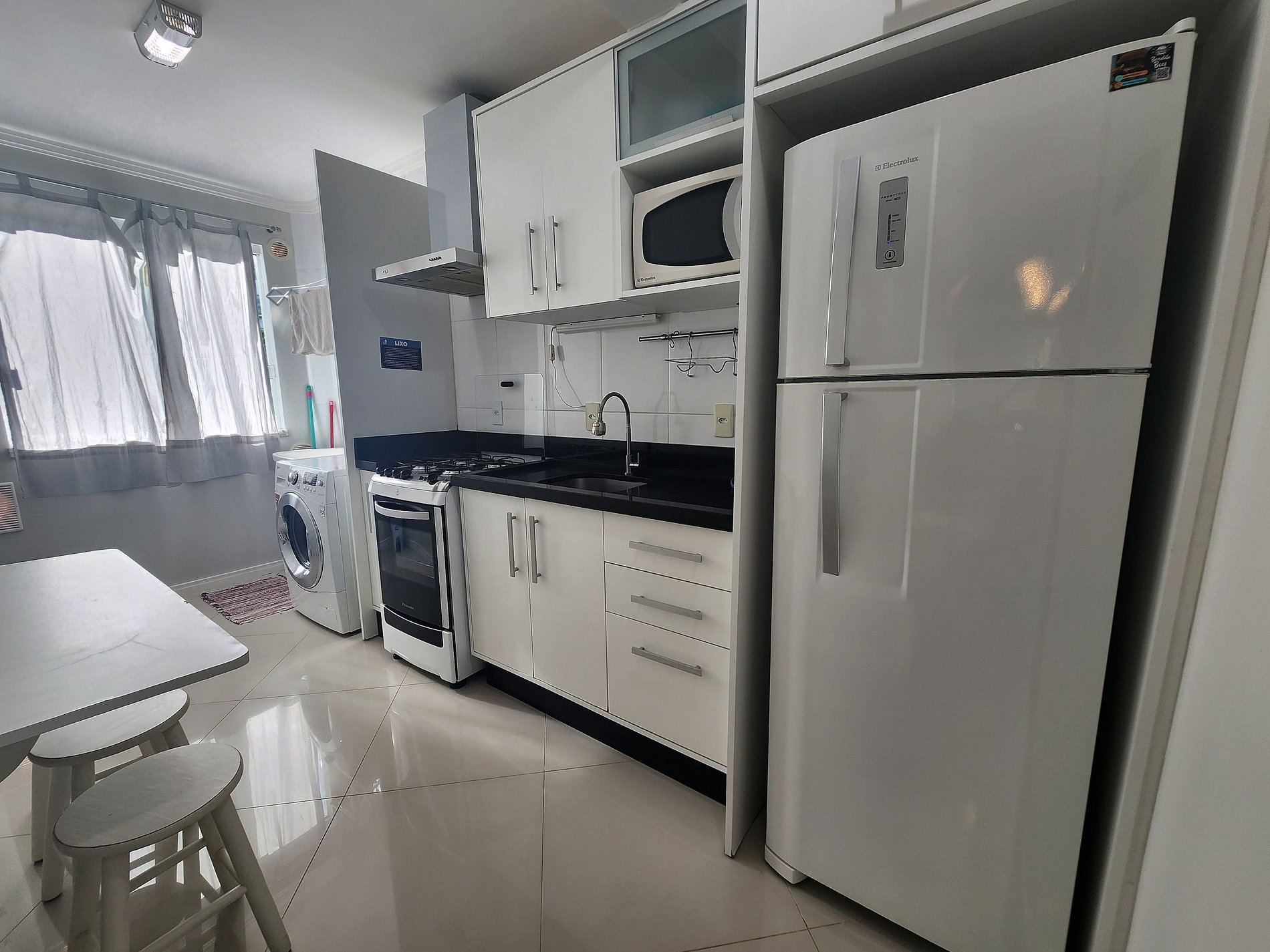 - Cozinha equipada com geladeira, fogão elétrico, microondas, forno, louças, panelas, liquidificador, torradeira;