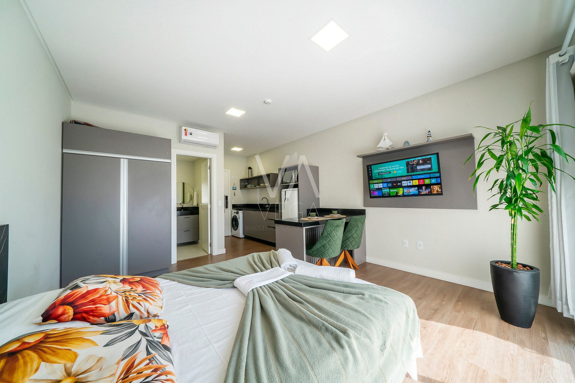 Flat com cama de casal e uma auxiliar, banheiro completo, cozinha com todos utensílios, sacada com churrasqueira, piscina aquecida no inverno e noite, playground para crianças, área externa no Rooftop 360 com incrível vista mar, elevador, garagem para 1 carro, roupas de cama.