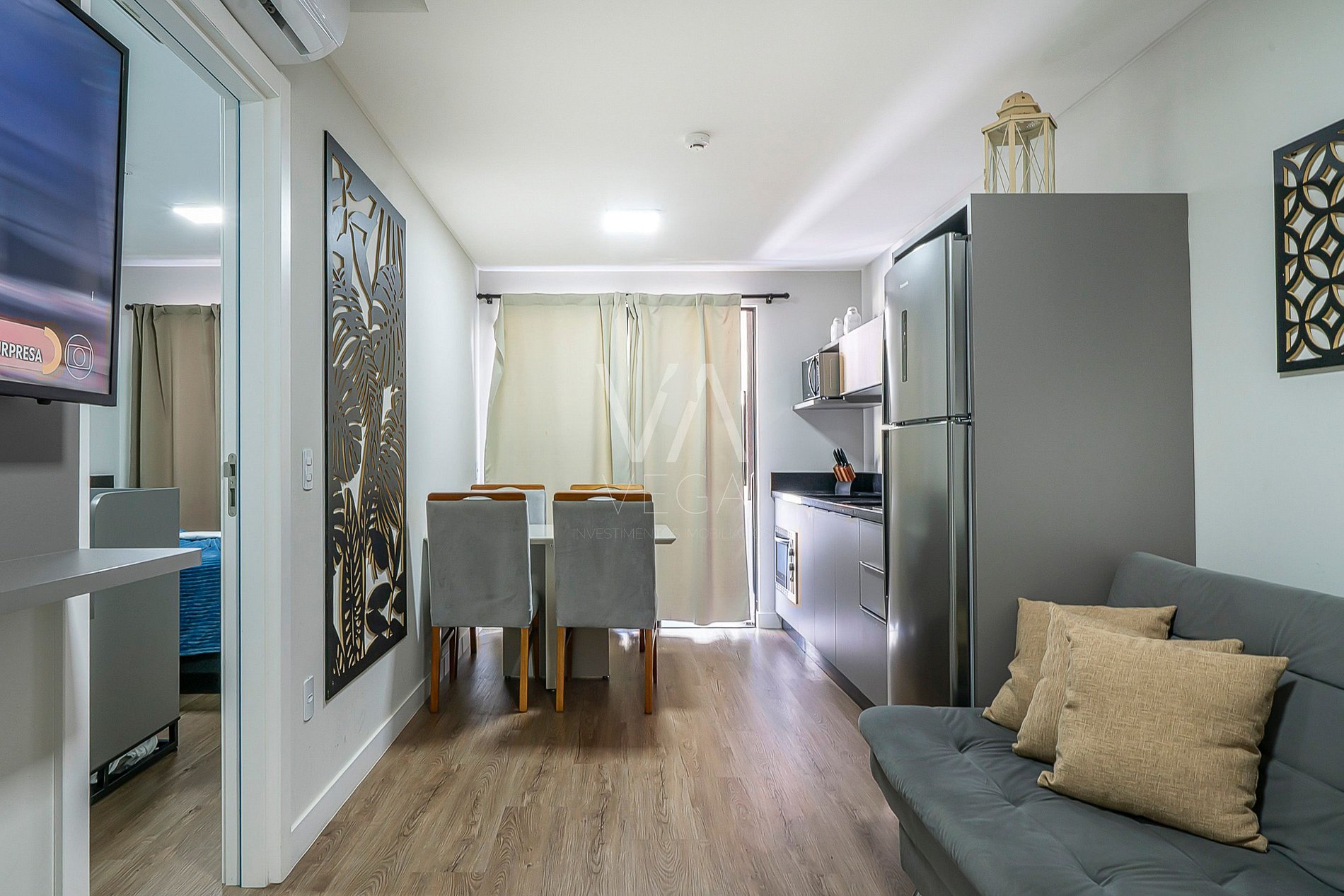- Cozinha com todos utensílios e sala de estar integrados com sofá cama, tv smart e ar condicionado;