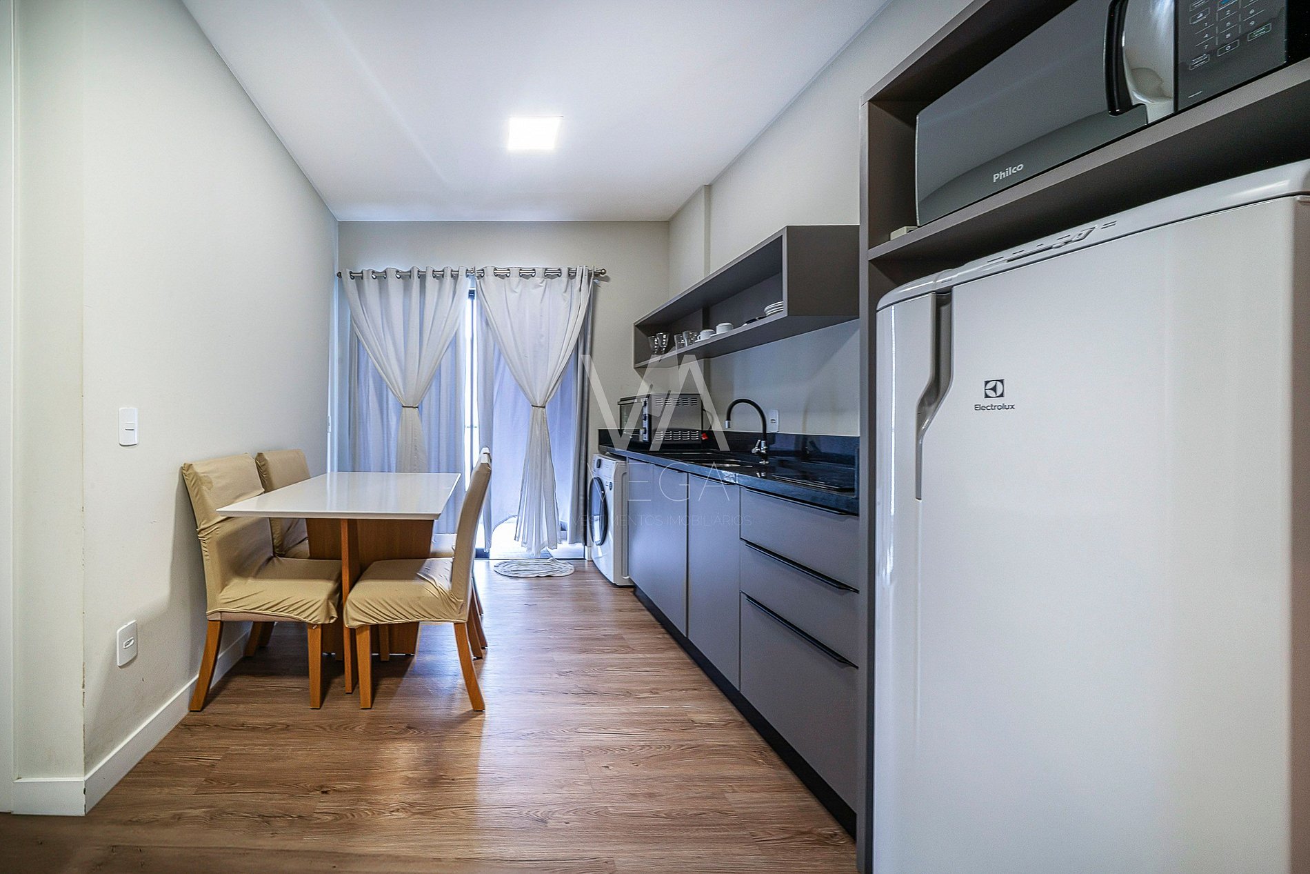-Cozinha com mesa de jantar de 4 lugares, eletrodomésticos, eletroportáteis, talheres e panelas;