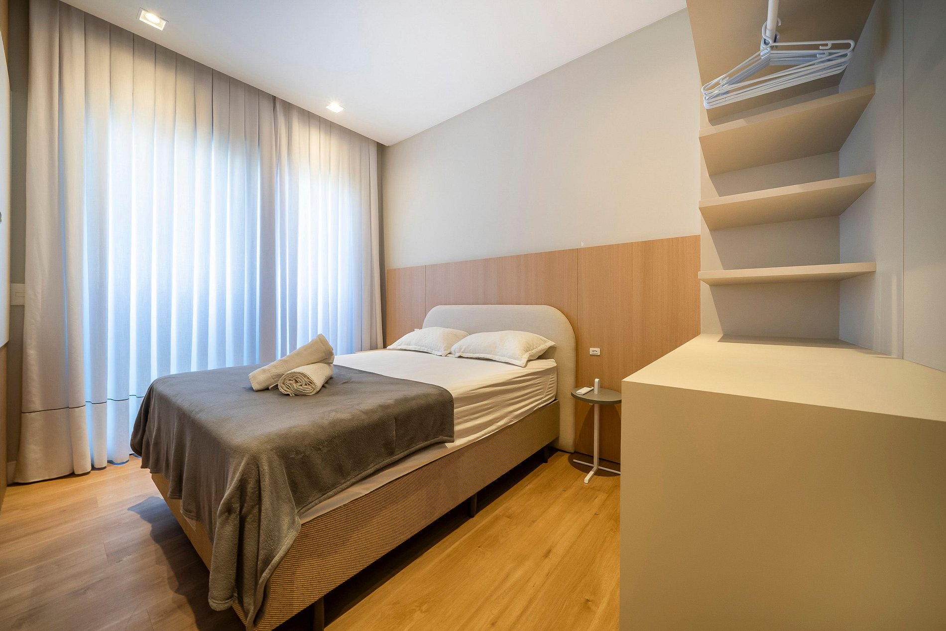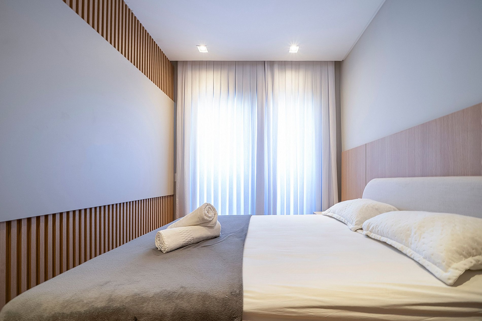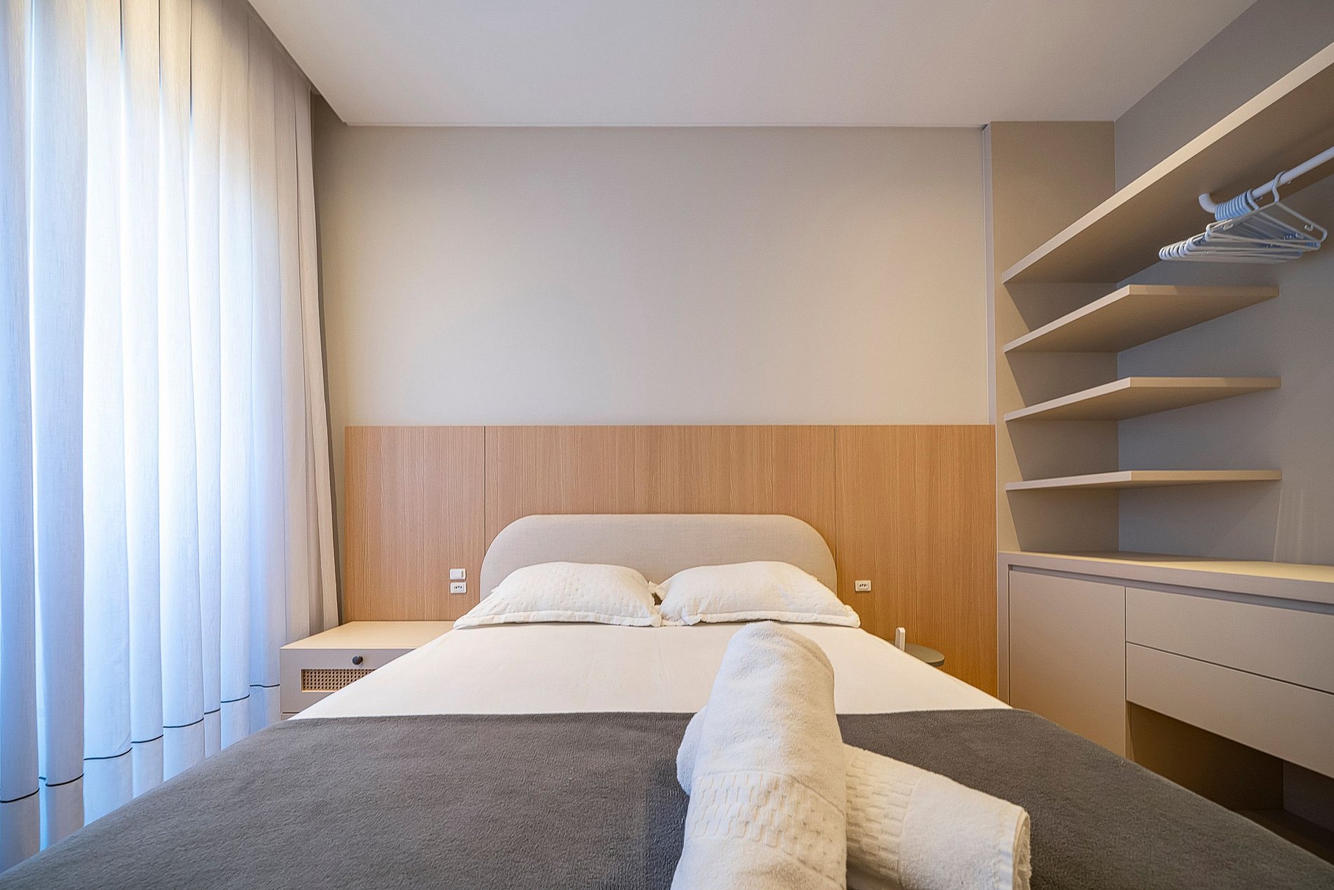 1 cama de casal, ar condicionado, armário para roupas, cortina blackout, banheiro completo com ducha a gás;
