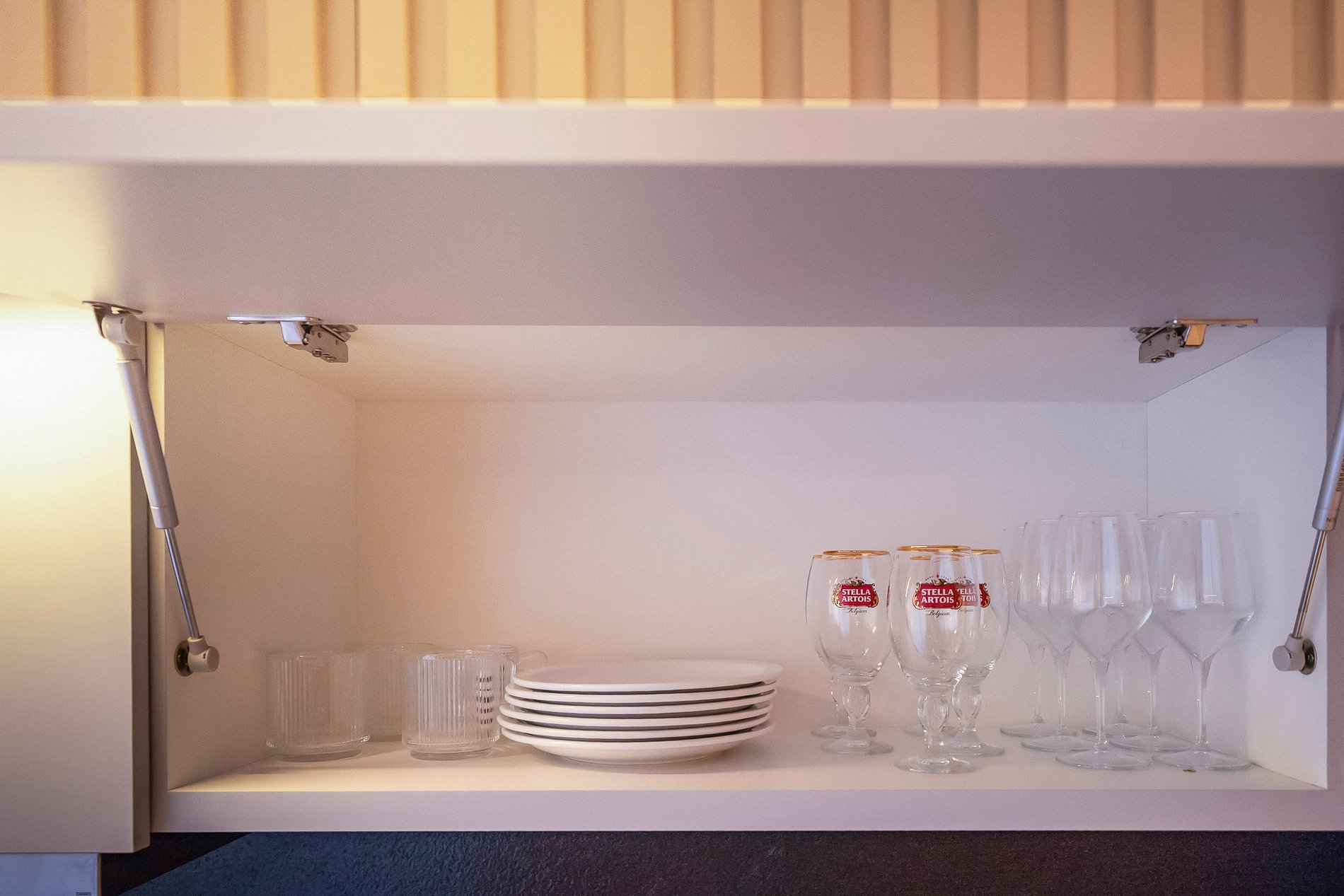 ar condicionado, mesa de jantar, taças de vinho e louça completa