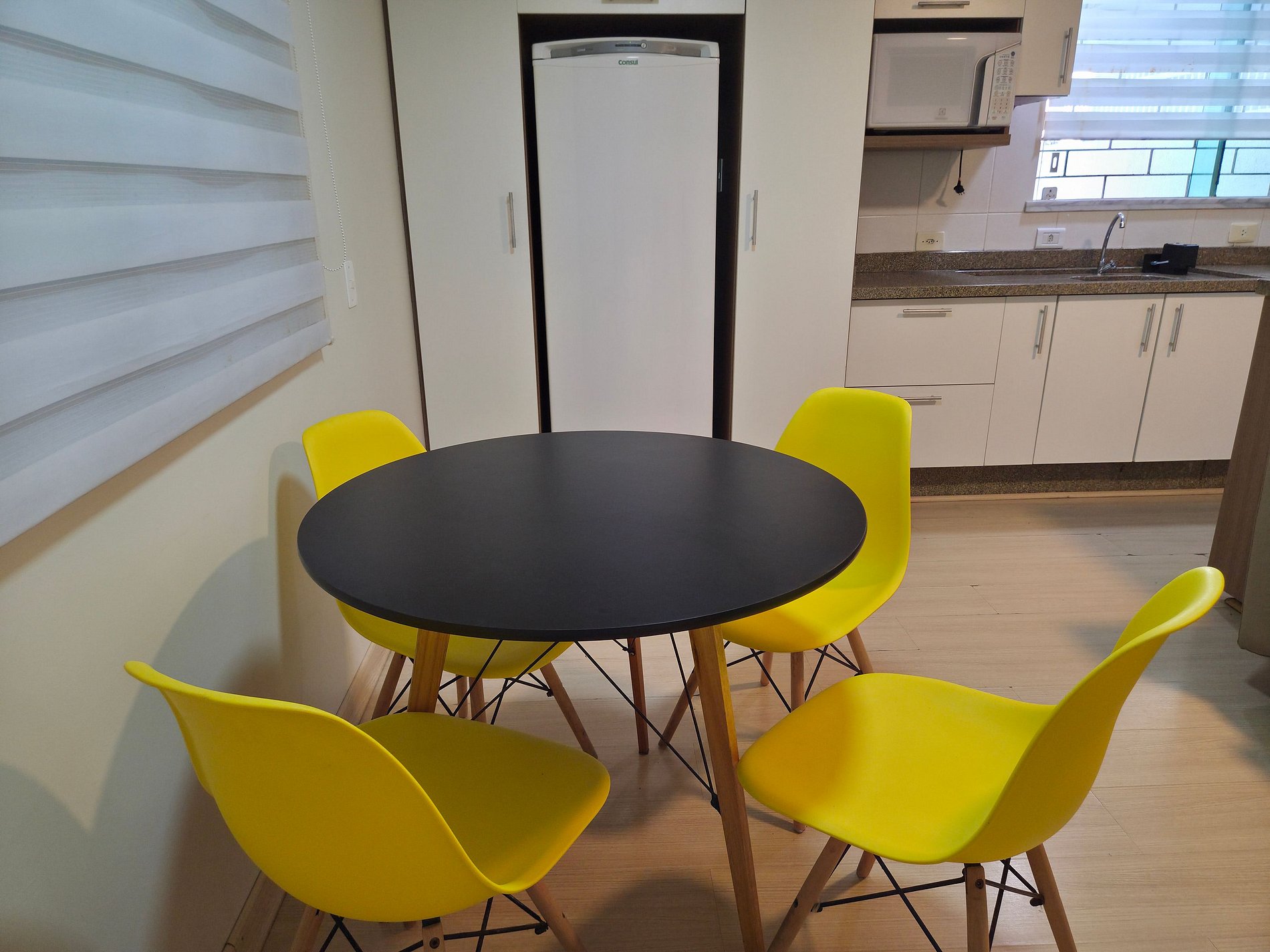 - Cozinha equipada e sala de estar integradas, com sofá-cama, TV smart e ventilador;