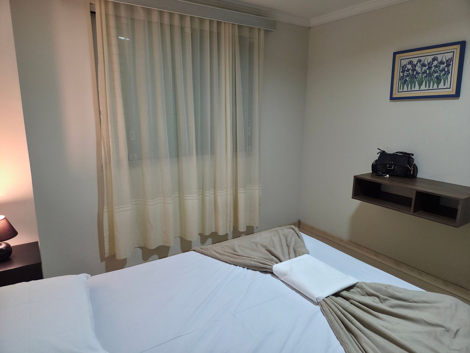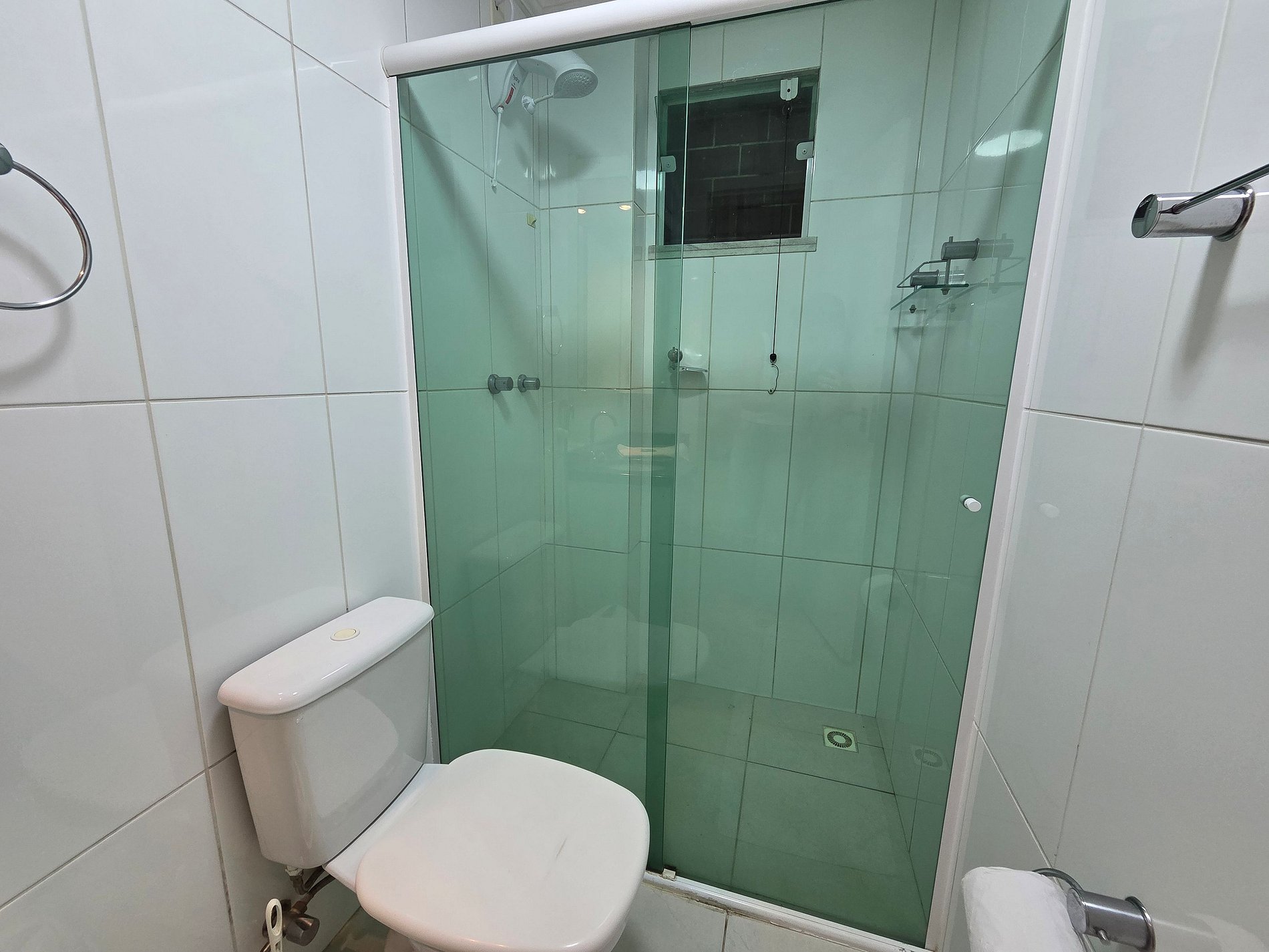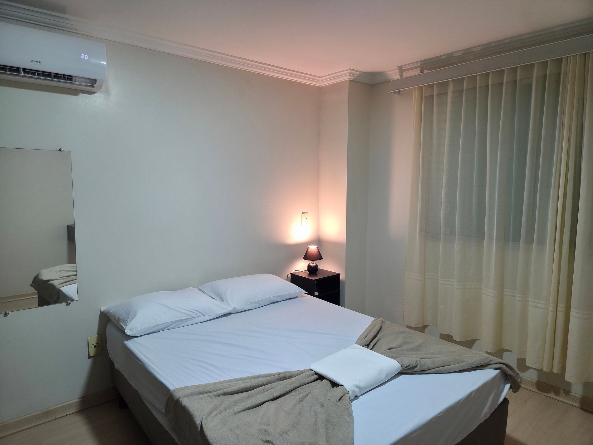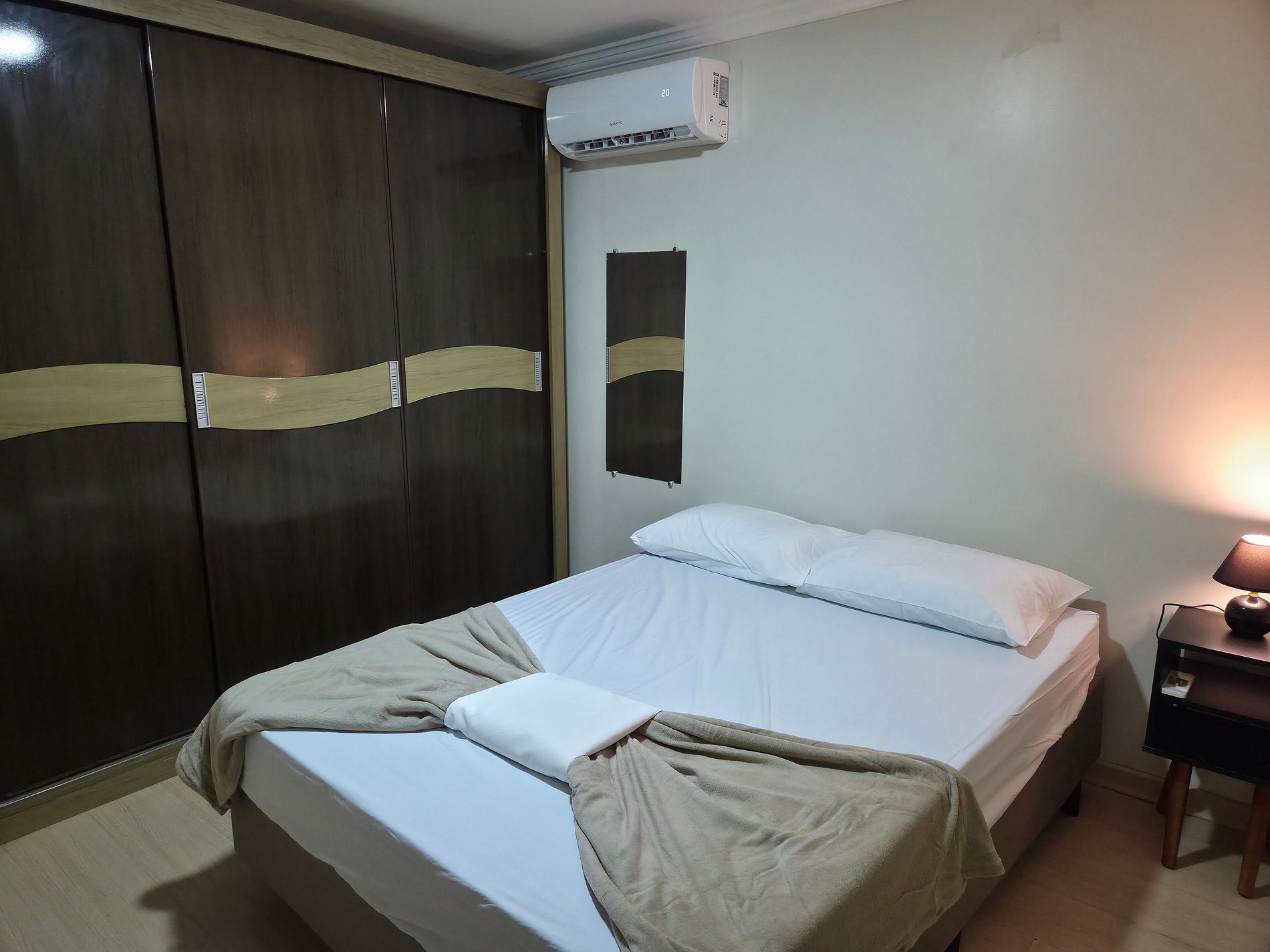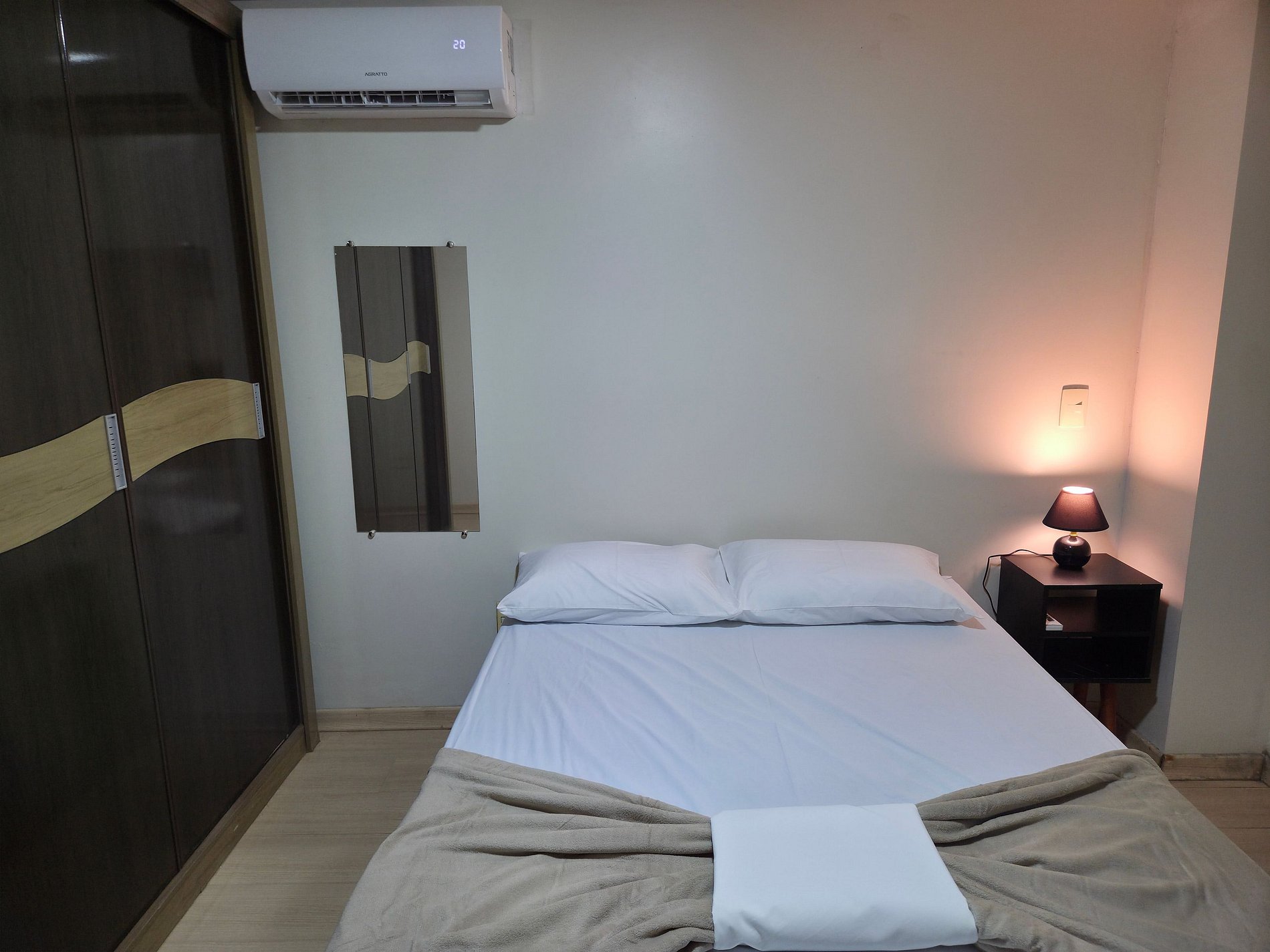 - 1 dormitório com cama de casal, guarda-roupa e ar-condicionado;