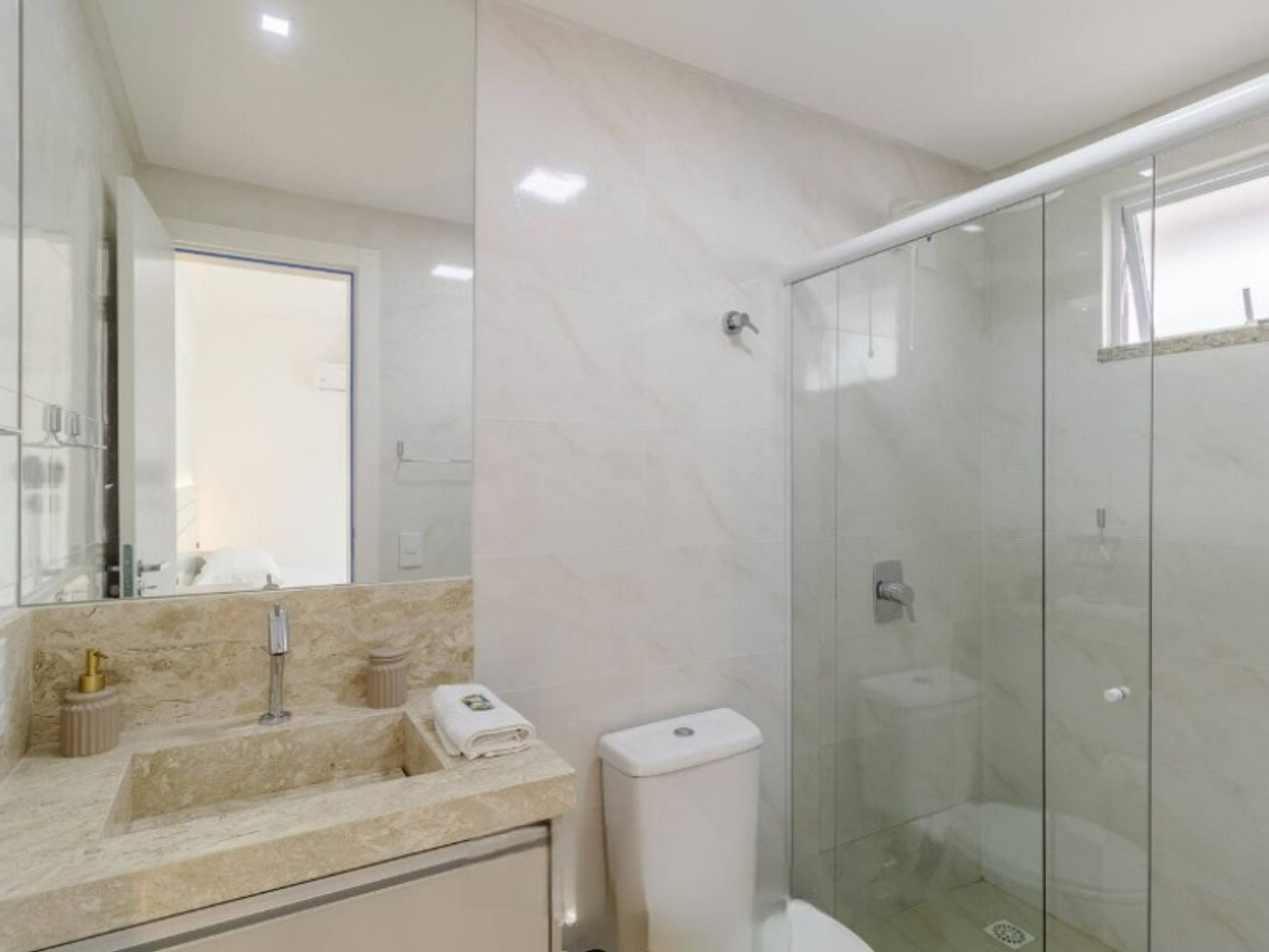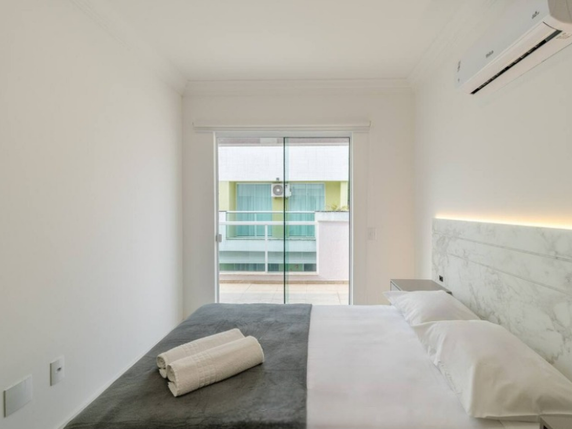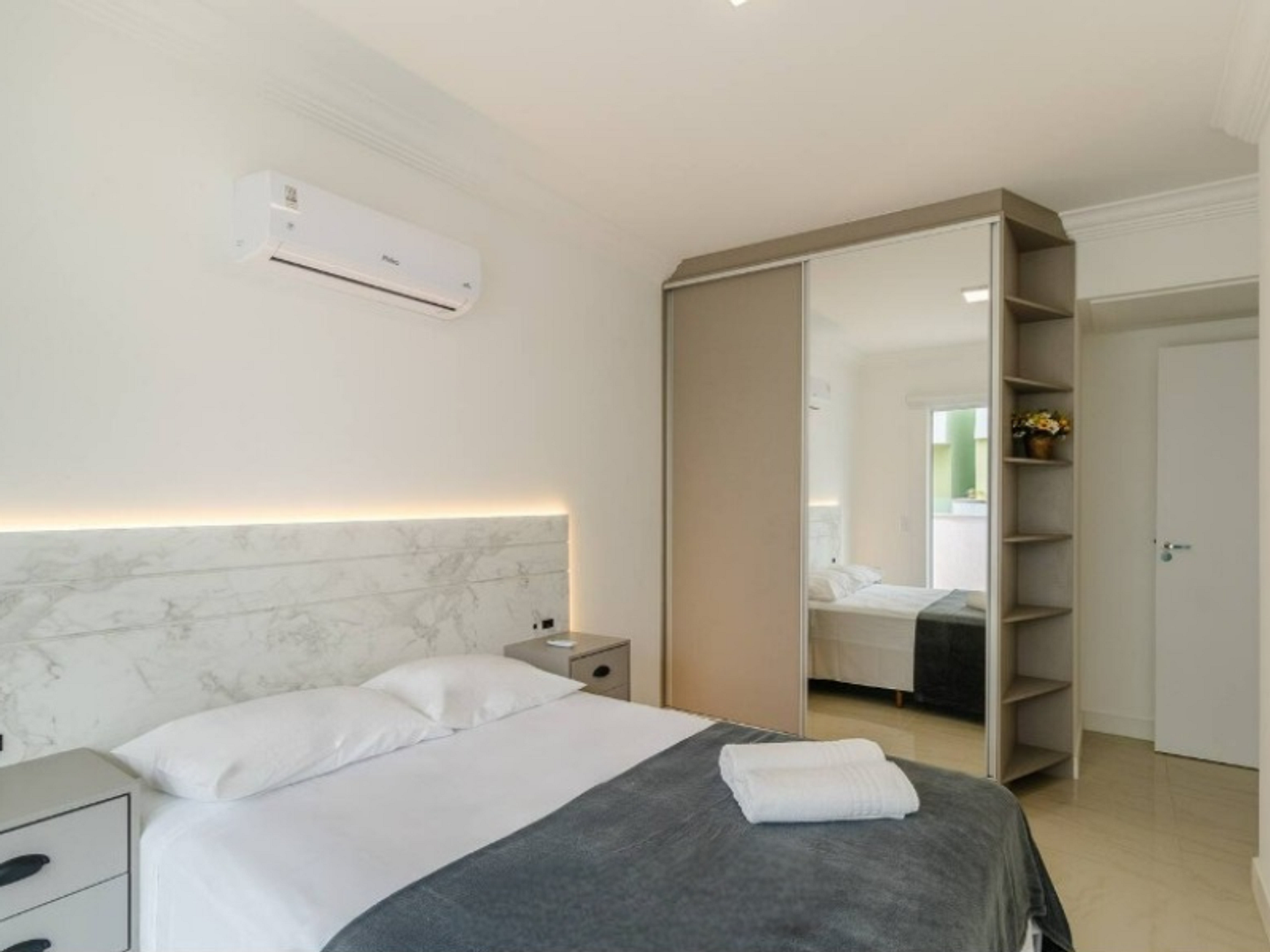 - 1 dormitório com 1 cama queen, guarda roupa e ar condicionado;