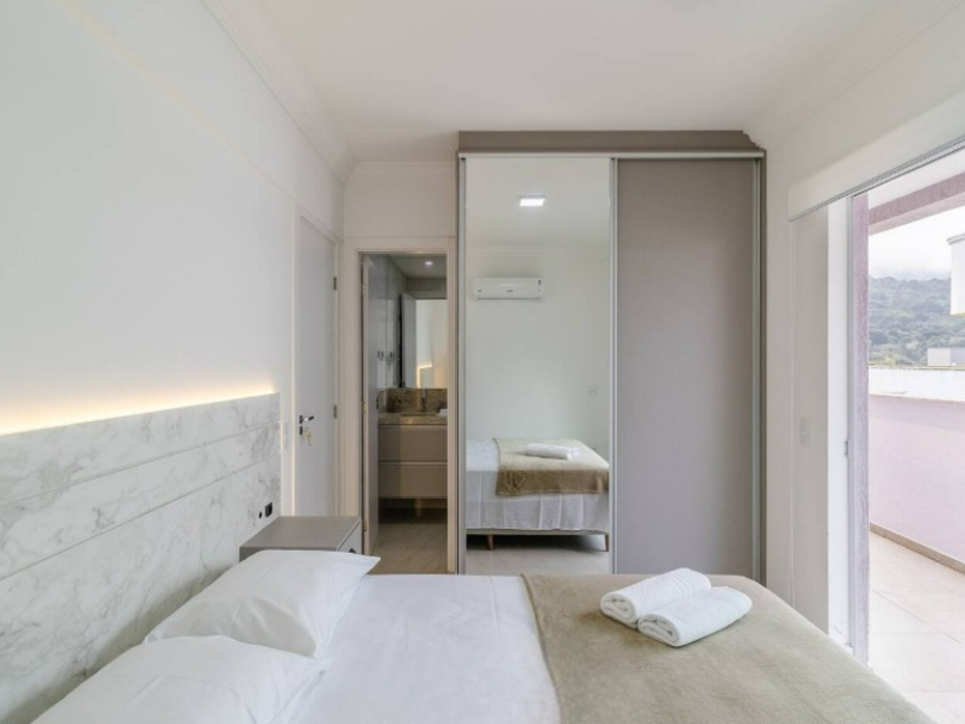 - 1 suíte com cama de casal, guarda roupa e ar condicionado;