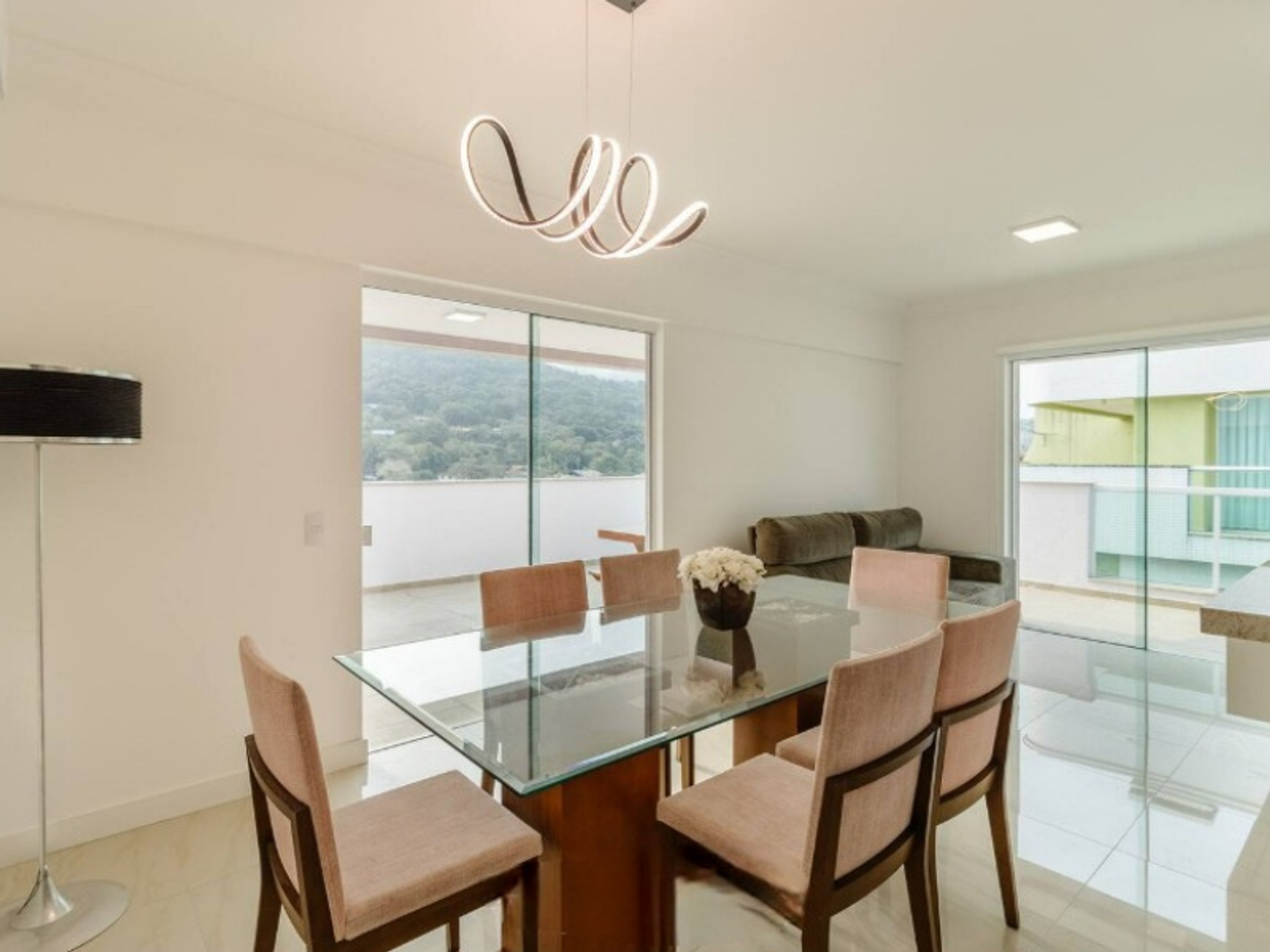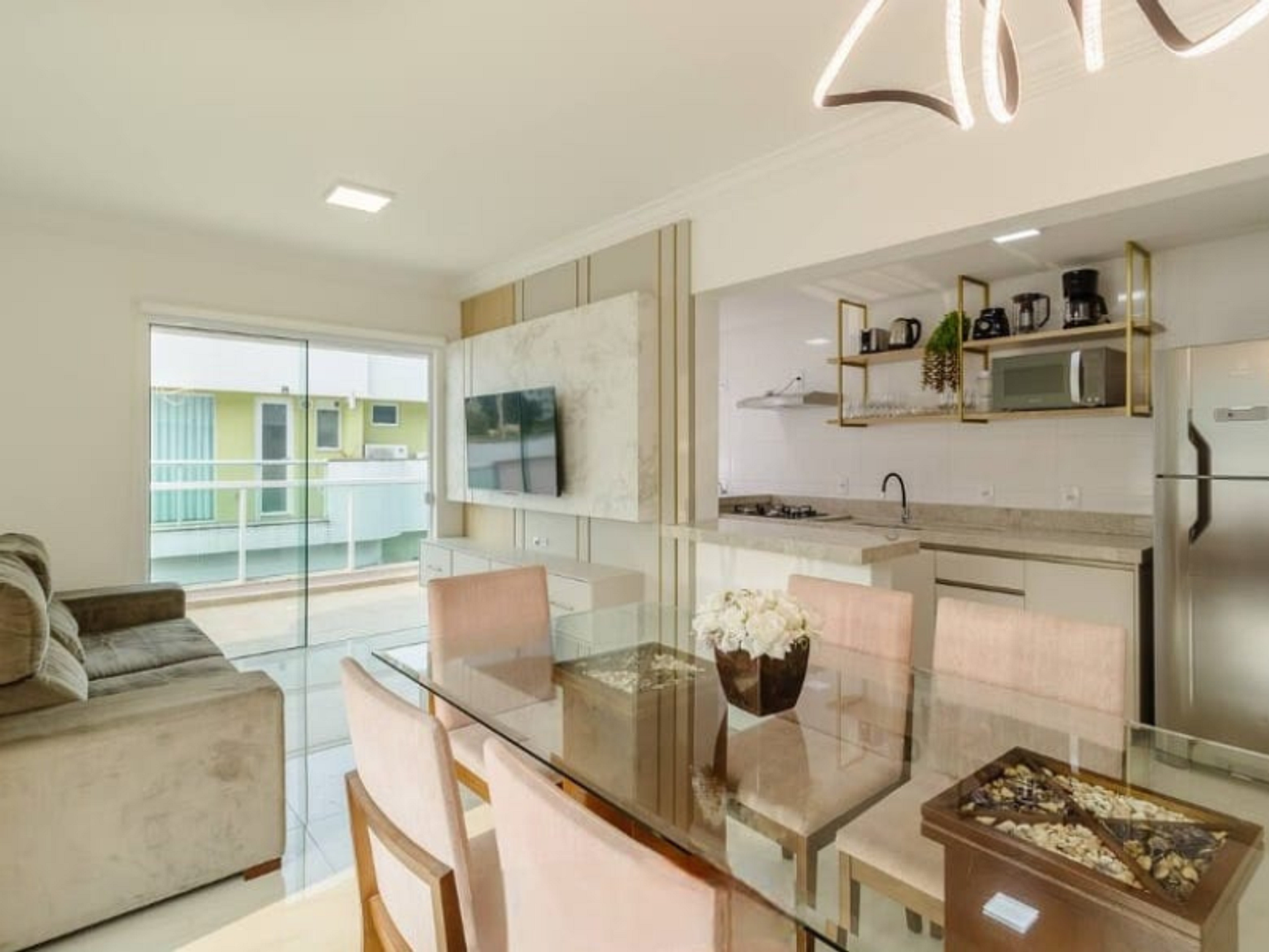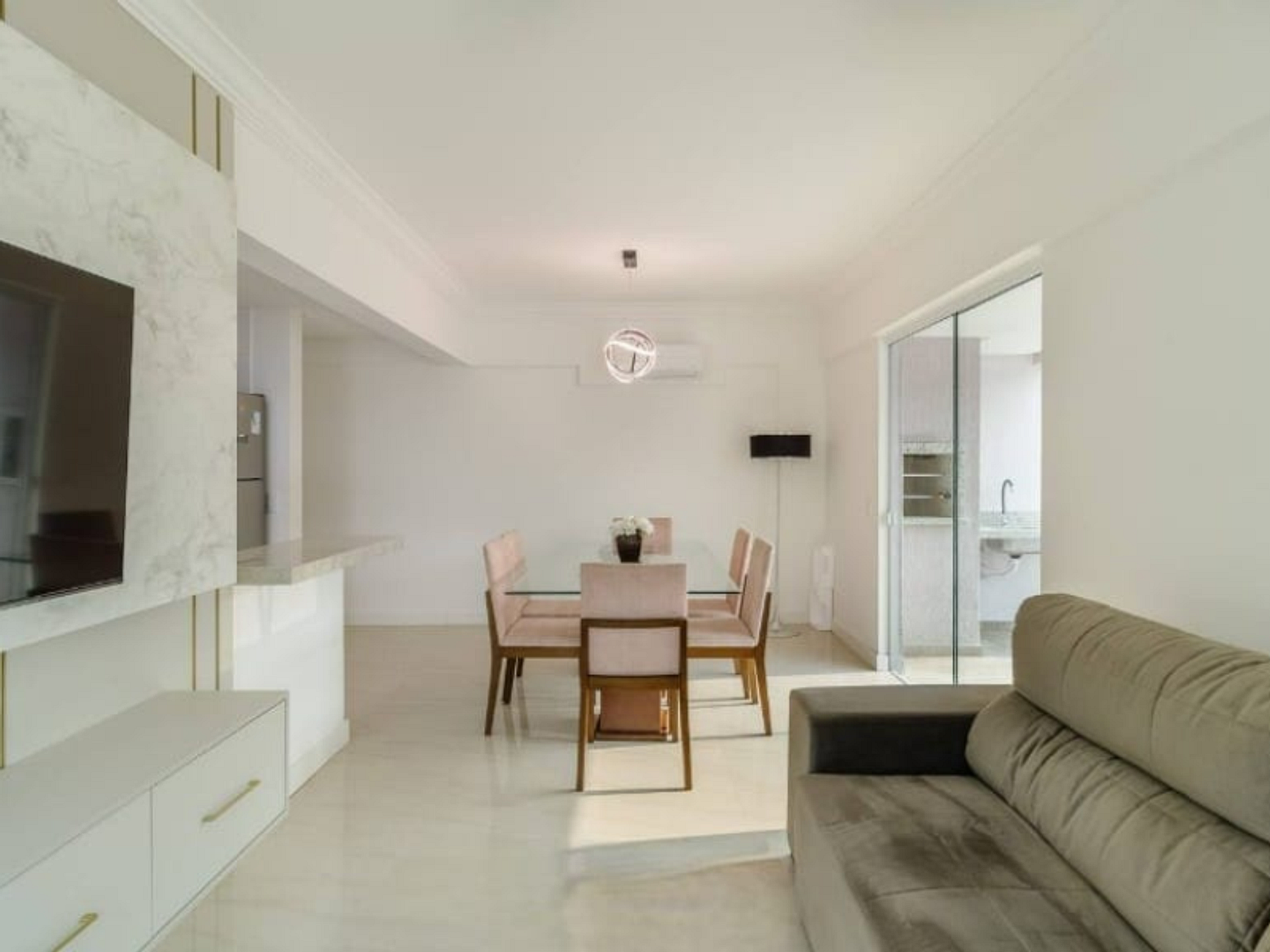 - Sala com sofá retrátil, TV smart, mesa de jantar com 6 lugares;