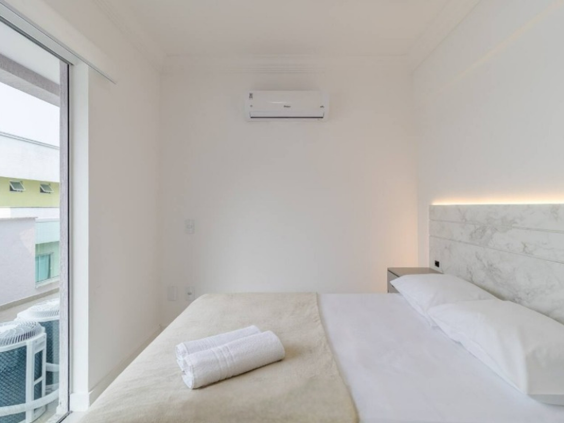 - 1 dormitório com 1 cama queen, guarda roupa e ar condicionado;