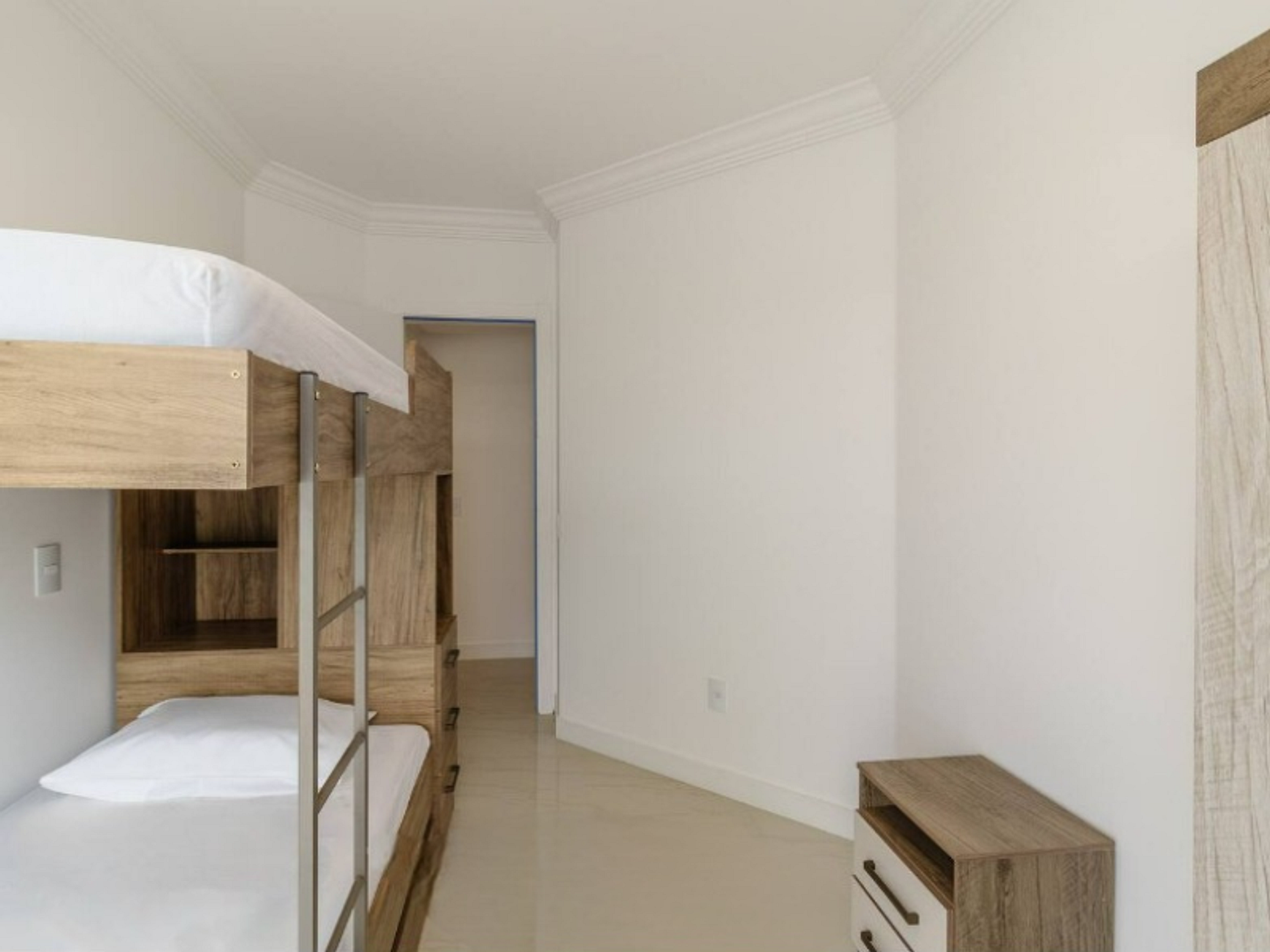 - 1 dormitório com 1 beliche para 2 pessoas, mais uma auxiliar solteiro, guarda roupas e ar condicionado;