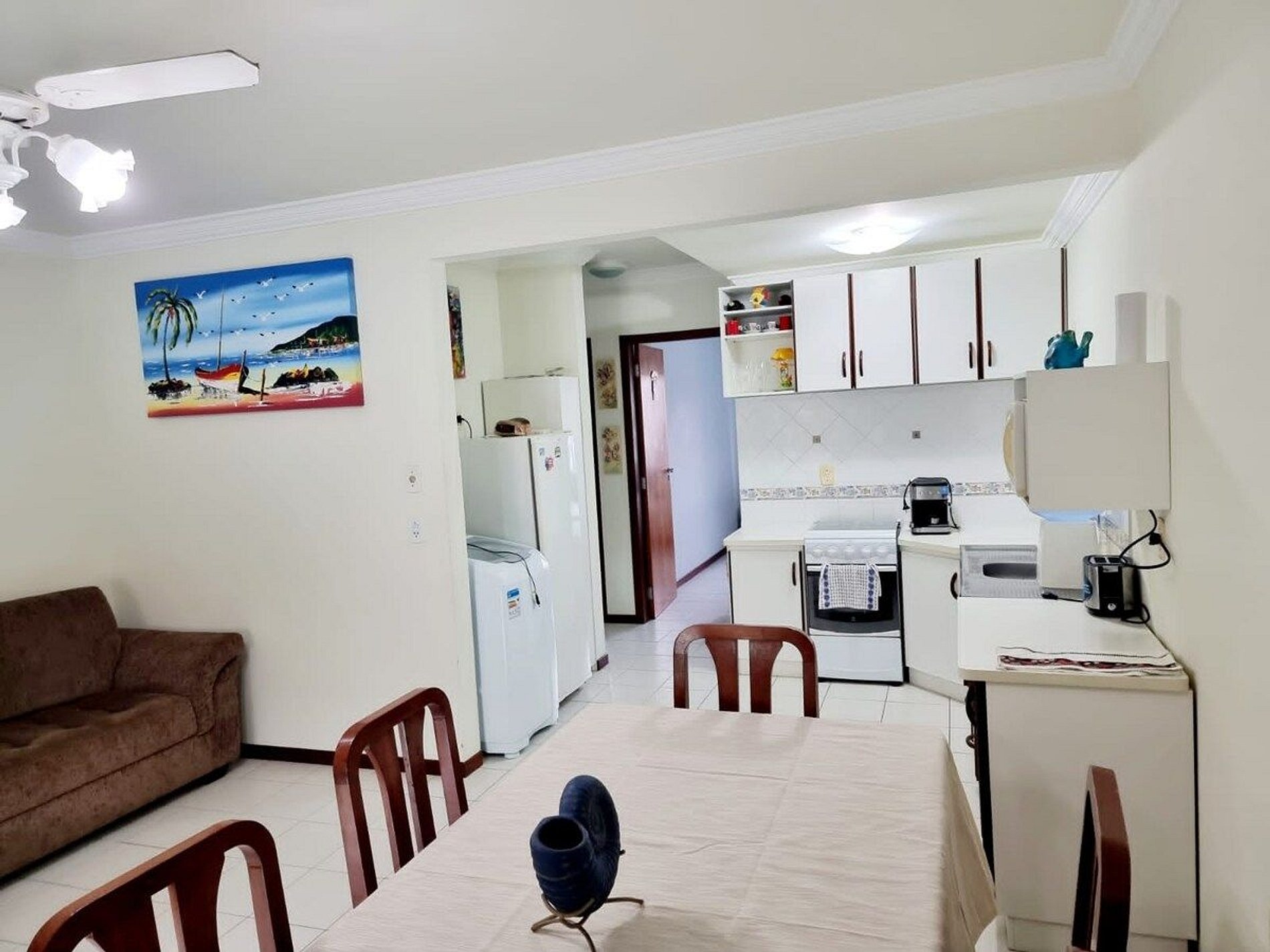 - Sala de estar com sofá, ar condicionado, Tv smart, ventilador de teto, mesa com 6 lugares e integrada com a cozinha equipada com utensílios, talheres, pratos,copos, panelas, liquidificador, torradeira, cafeteira, micro-ondas, fogão, geladeira, máquina de lavar;
