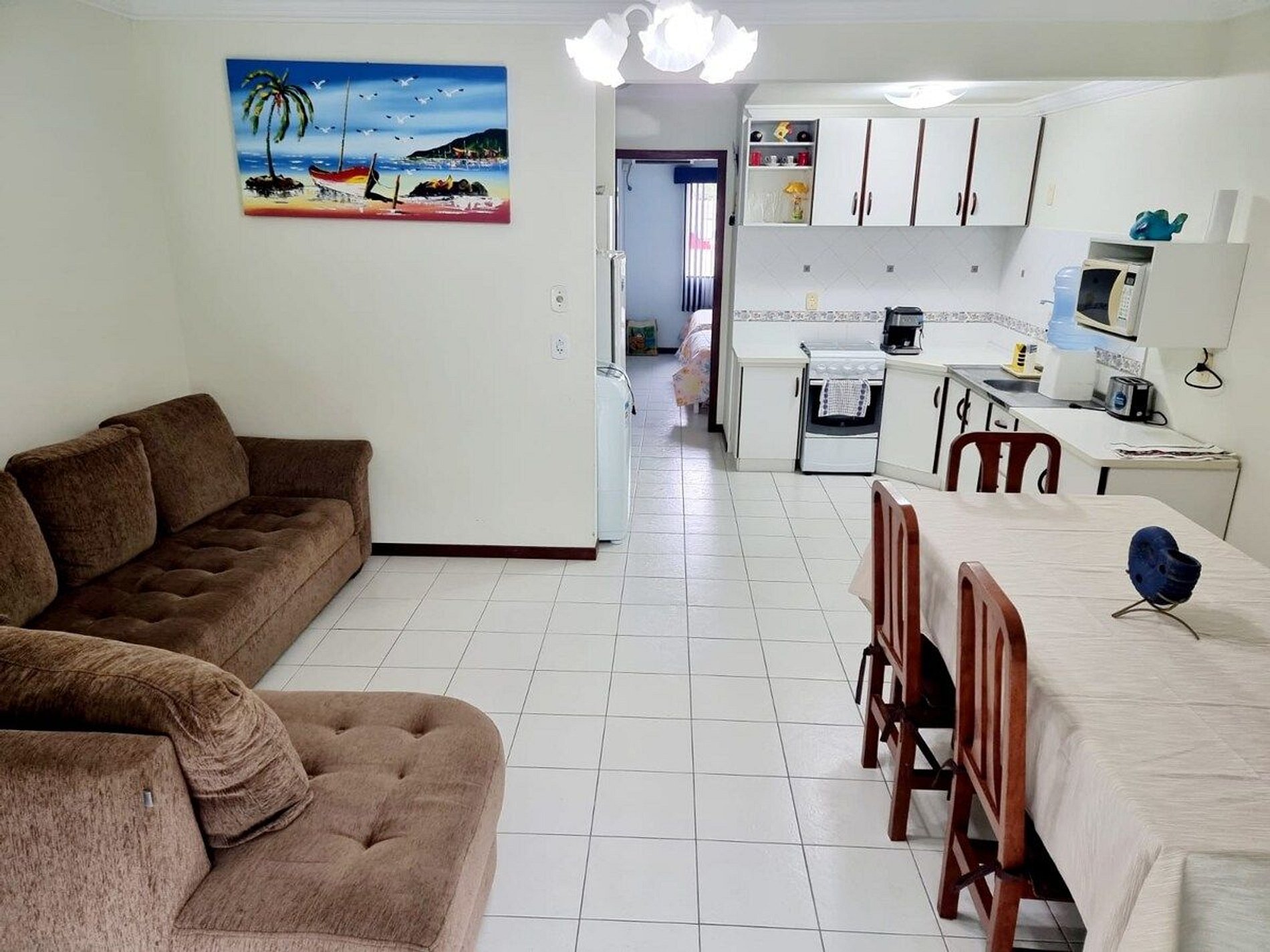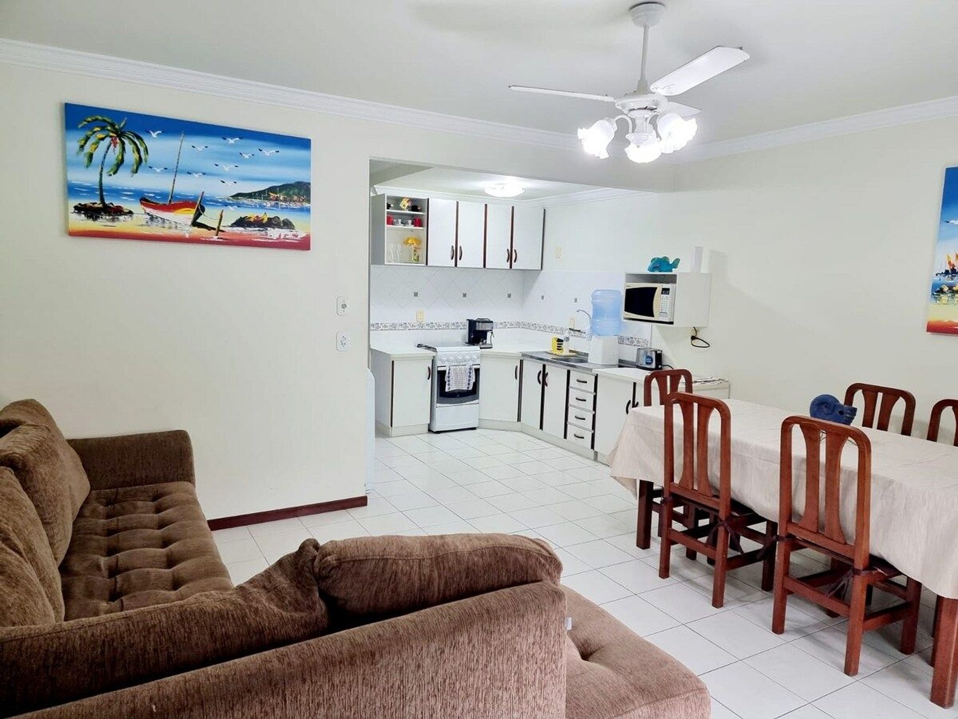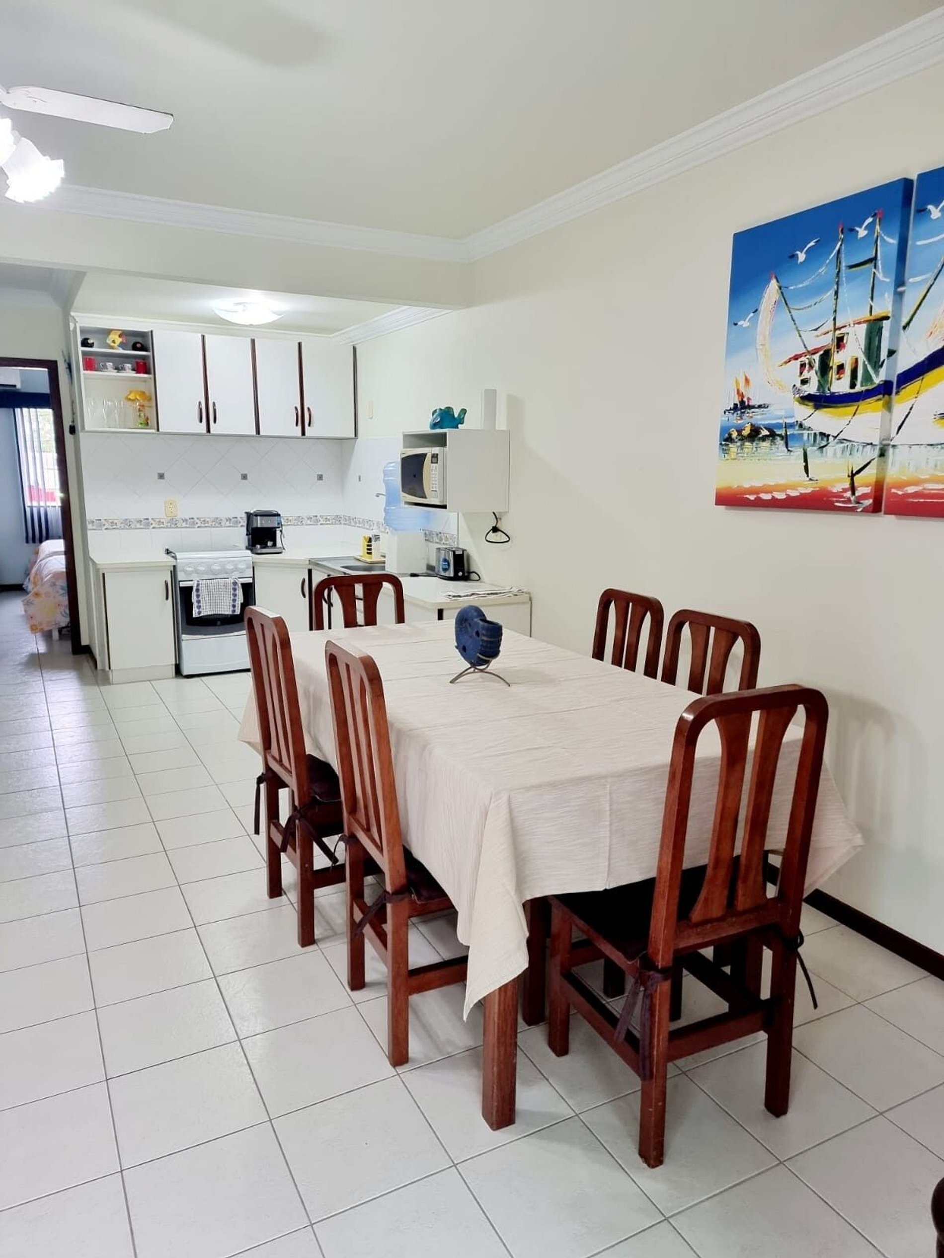 - Sala de estar com sofá, ar condicionado, Tv smart, ventilador de teto, mesa com 6 lugares e integrada com a cozinha equipada com utensílios, talheres, pratos,copos, panelas, liquidificador, torradeira, cafeteira, micro-ondas, fogão, geladeira, máquina de lavar;