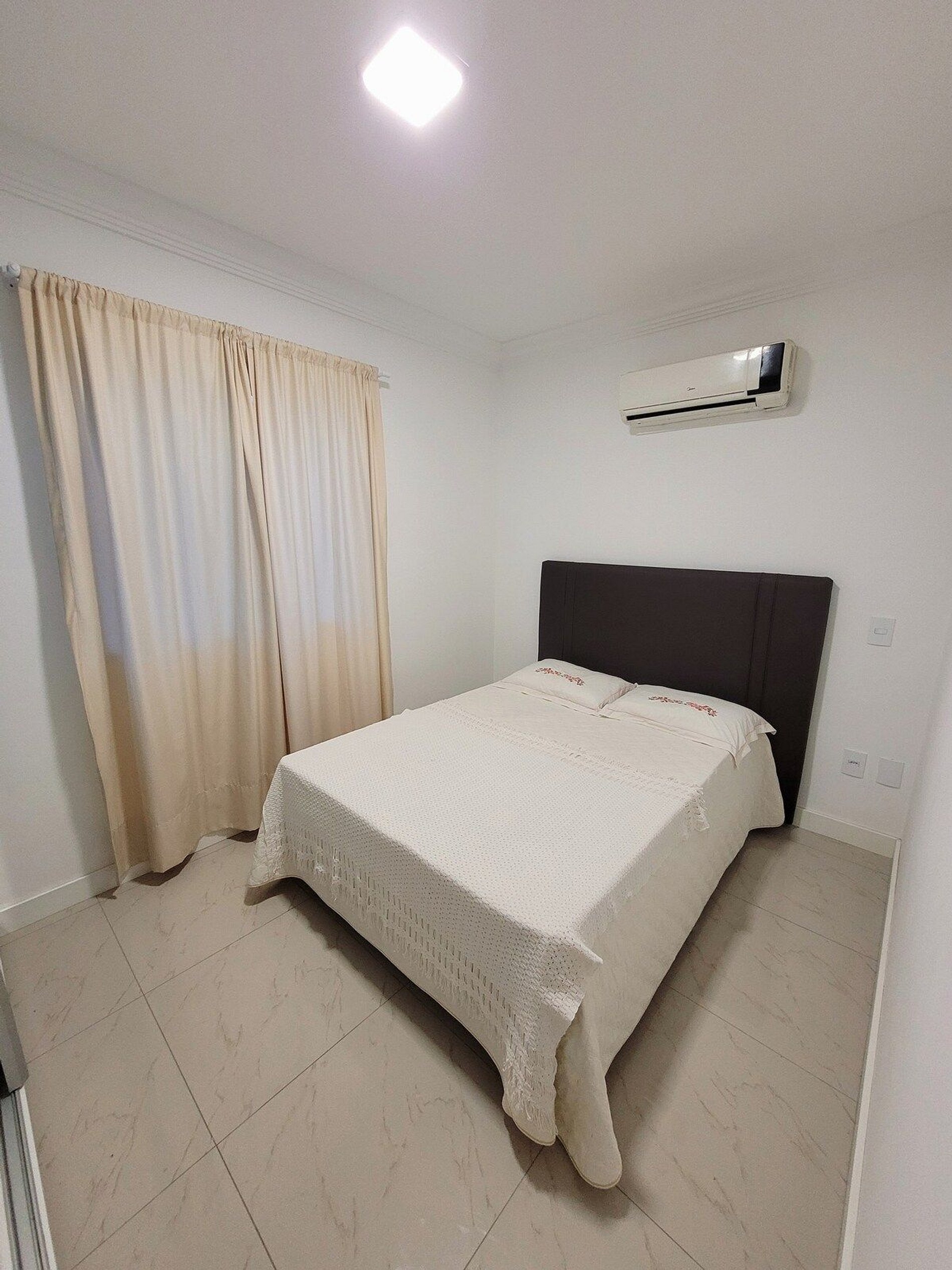 - 1 suíte com cama de casal, guarda roupa e ar condicionado;