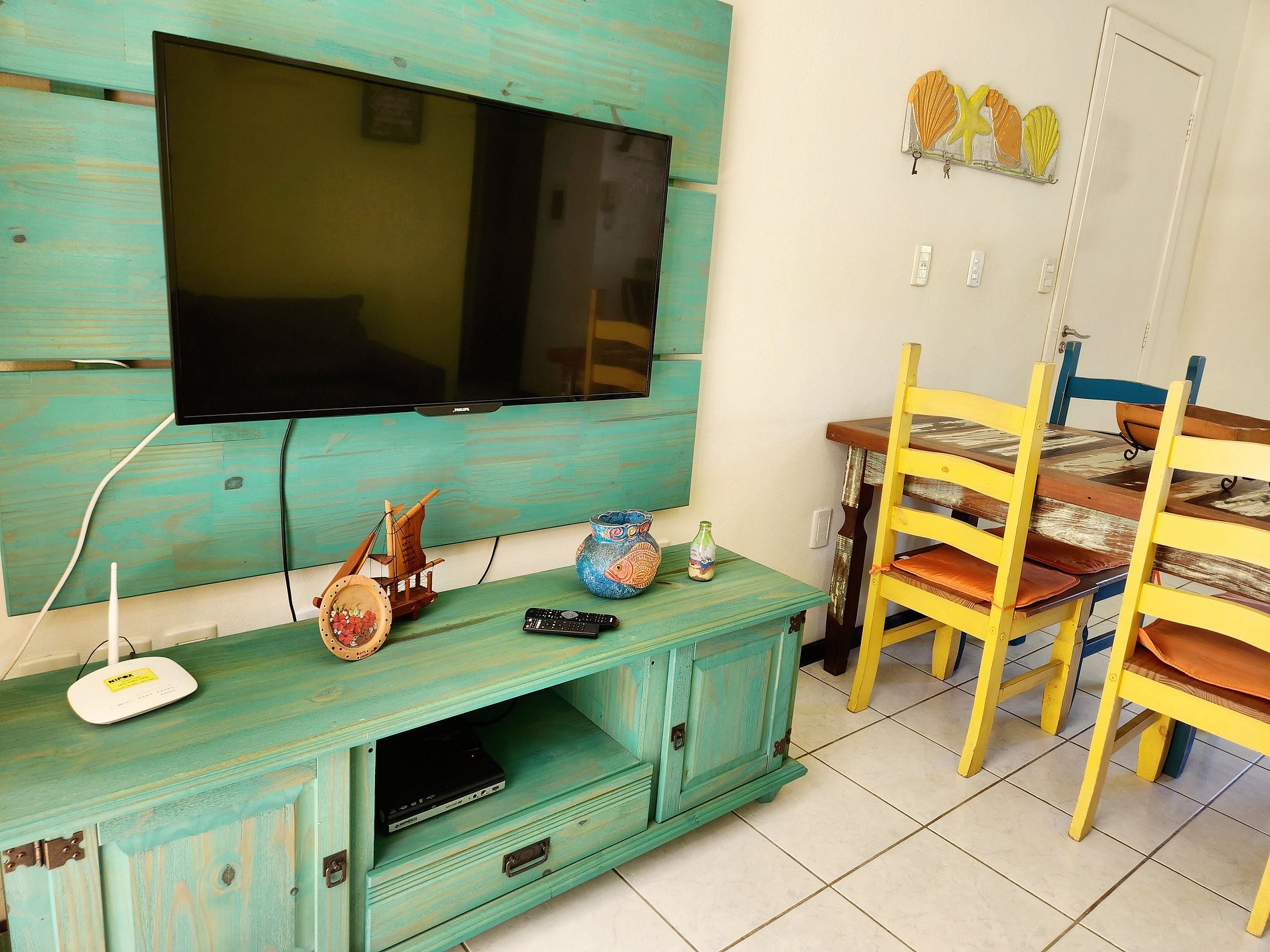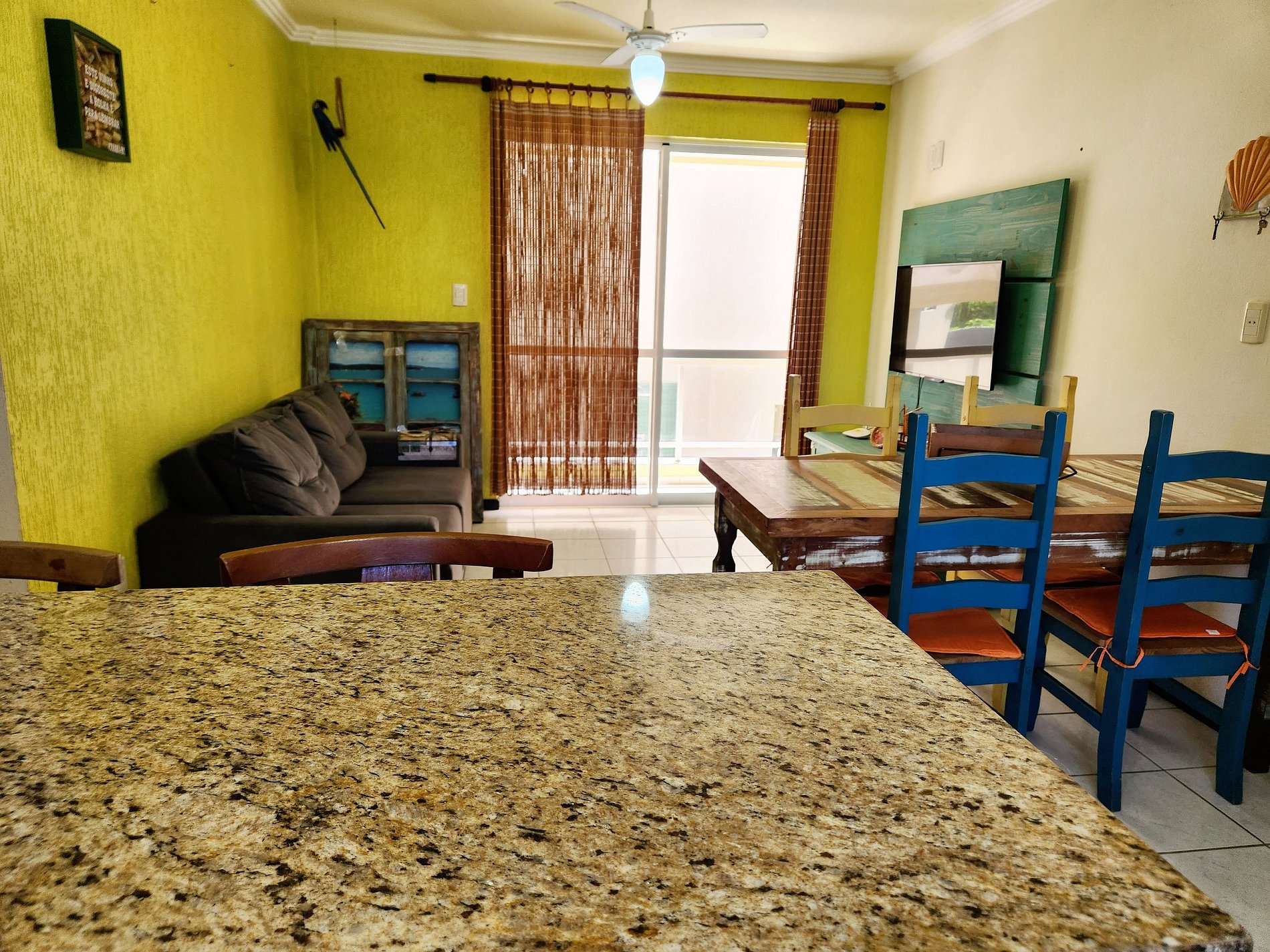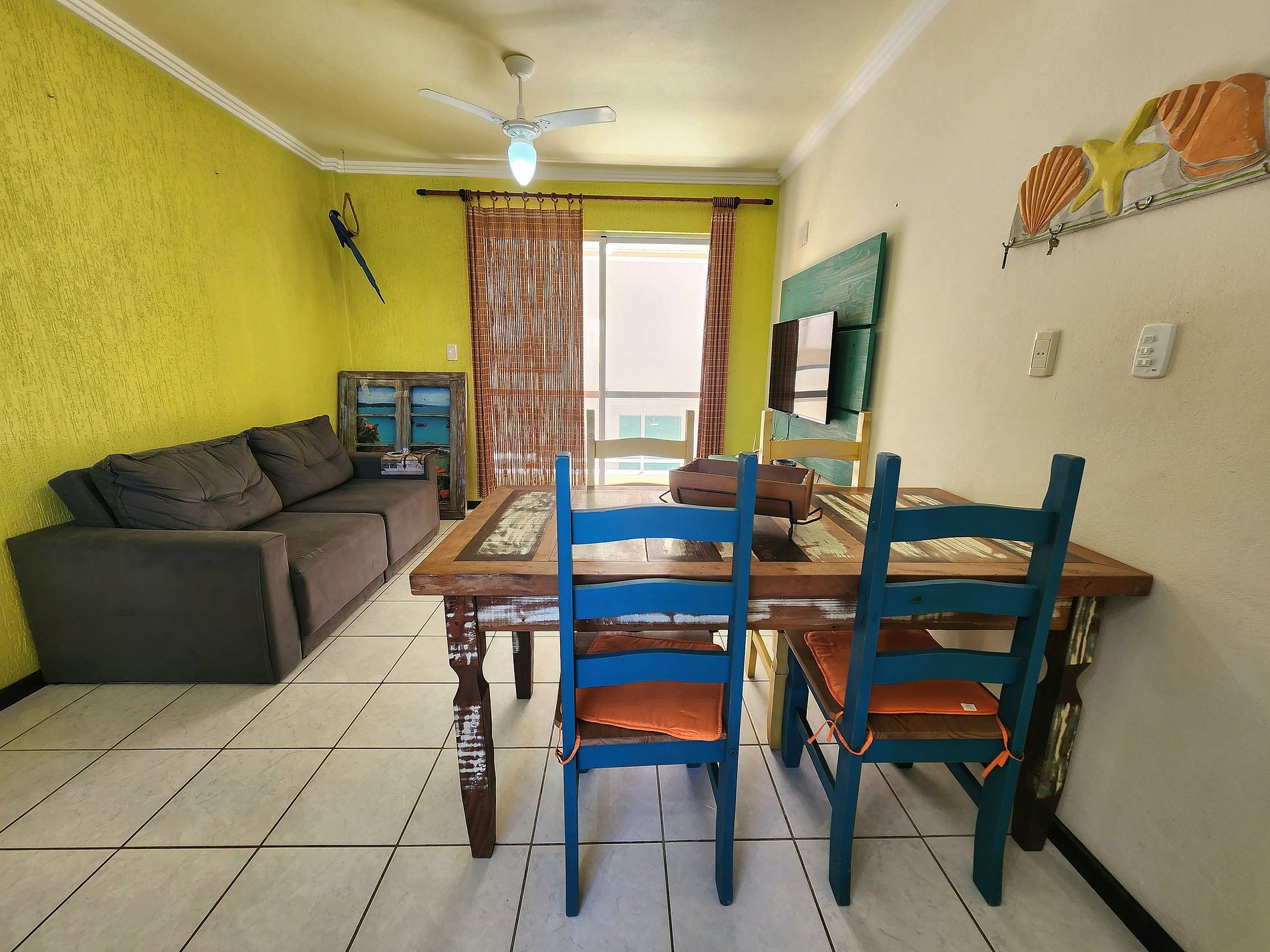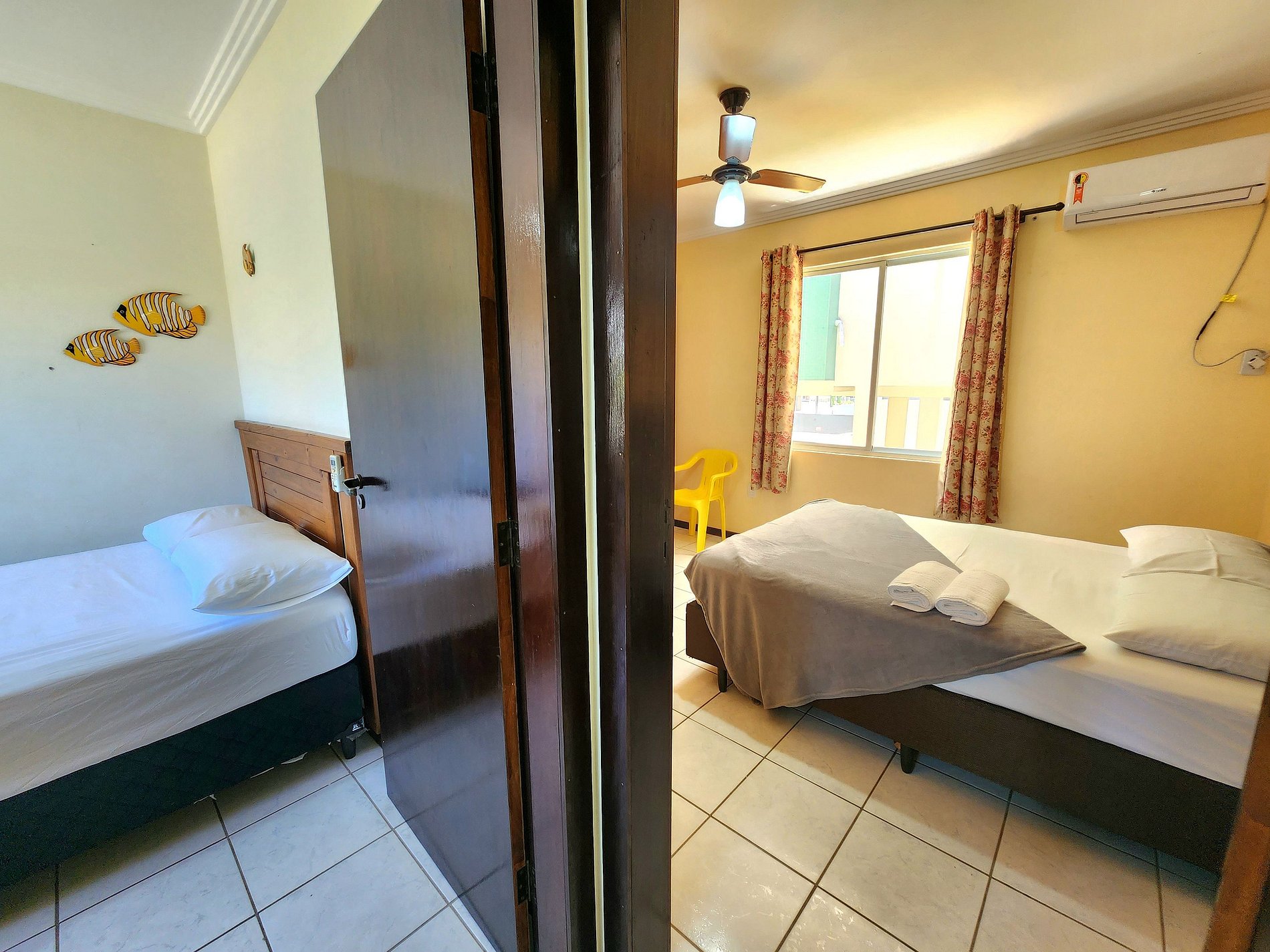 Possui 2 dormitórios com ar condicionado em cada e 2 camas de casal mais 2 colchões de solteiro. Sacada com churrasqueira, cozinha com bancada café e mesa de 4 lugares, sala com Tv smart, vaga de garagem descoberta.