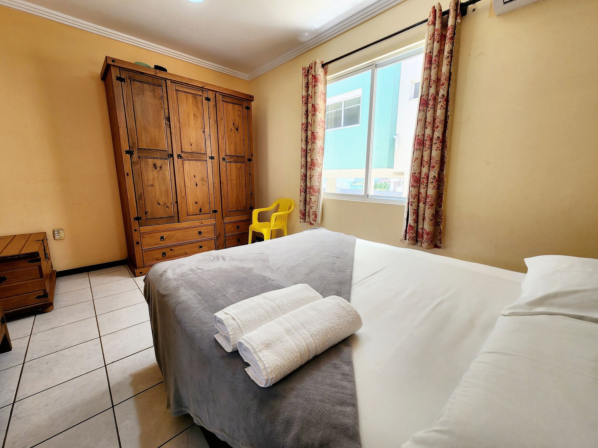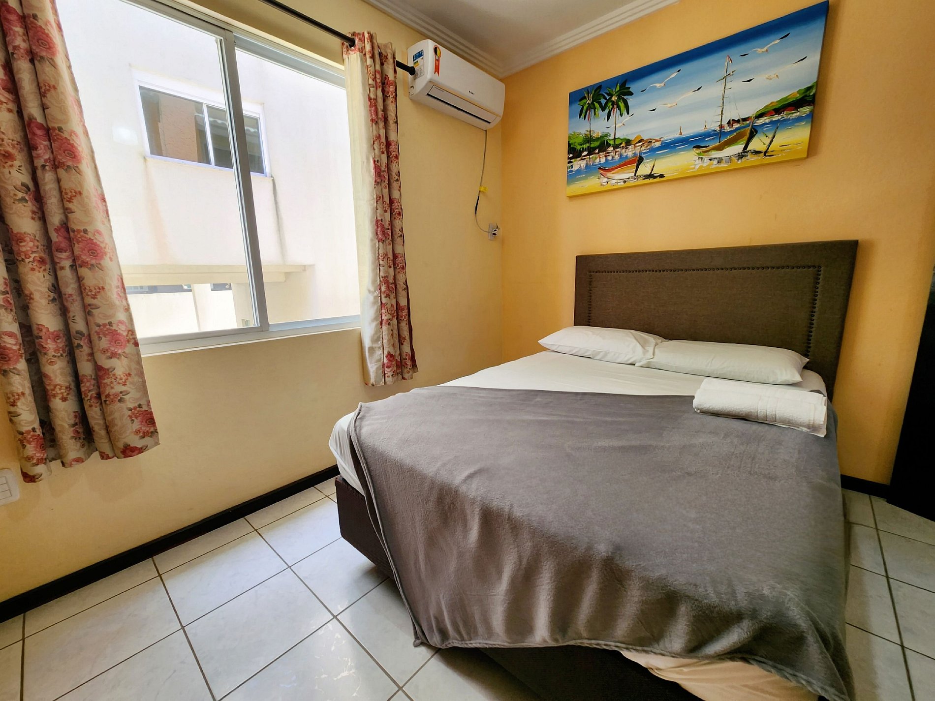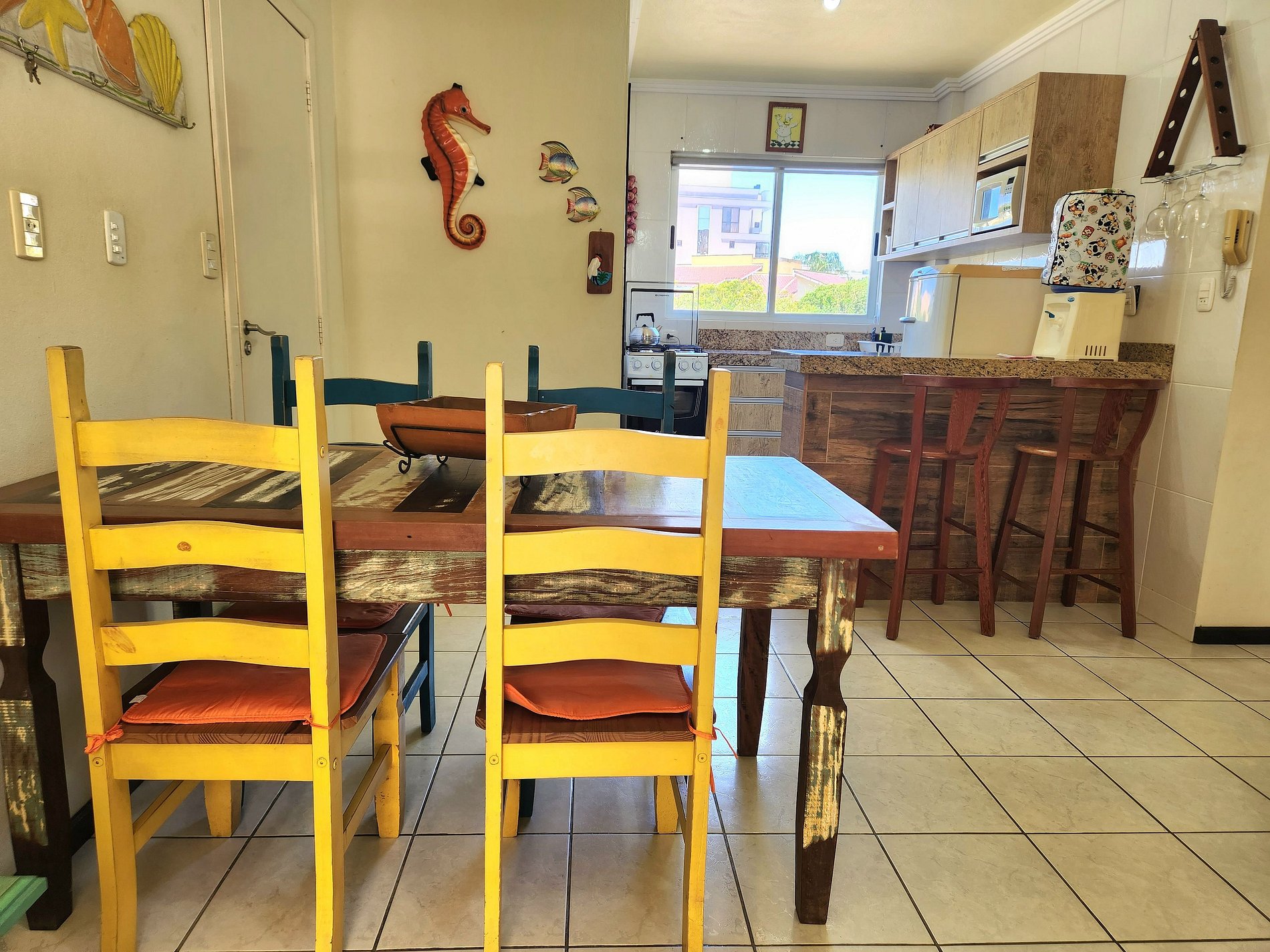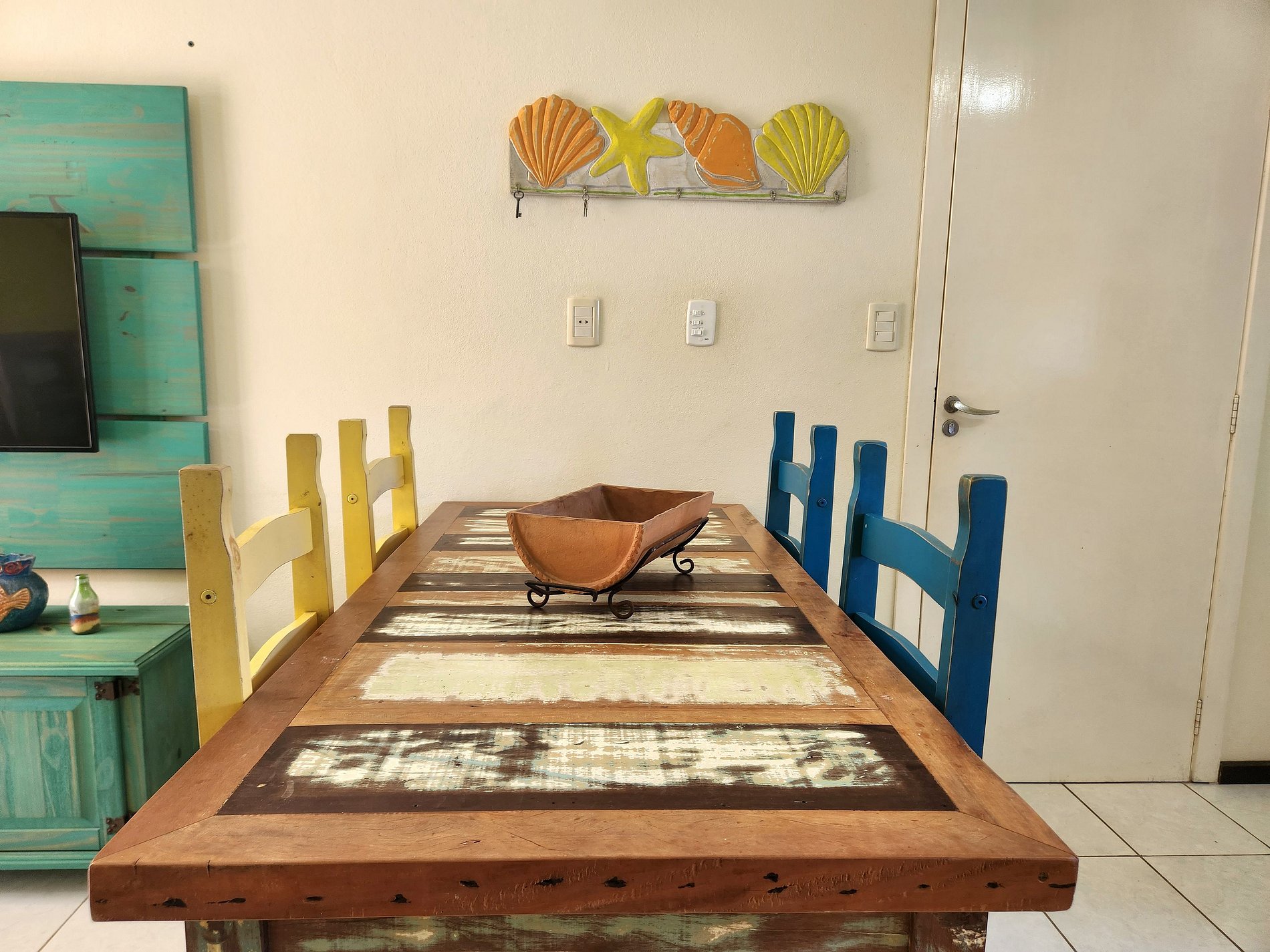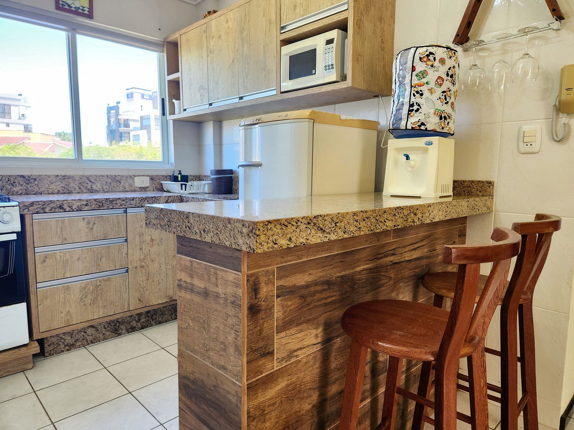 Possui 2 dormitórios com ar condicionado em cada e 2 camas de casal mais 2 colchões de solteiro. Sacada com churrasqueira, cozinha com bancada café e mesa de 4 lugares, sala com Tv smart, vaga de garagem descoberta.